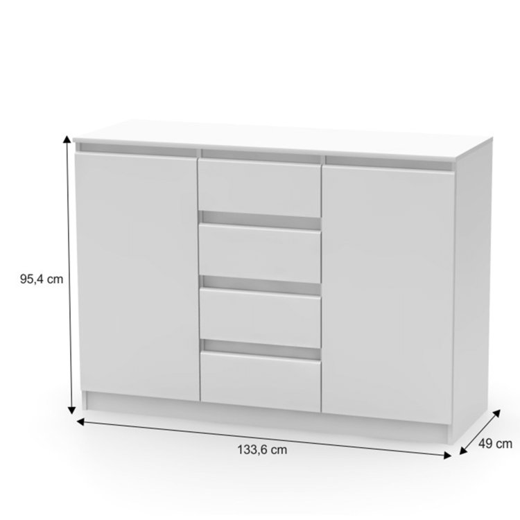 2 dverová komoda so 4 šuplíkmi HANY NEW 010 je dvojdverová so štyrmi šuplíkmi. Vaše veci bezpečne uschová za dvierkami, kde sa nachádza policová časť. Vyrobená je v bielom prevedení z kvalitnej laminovanej drevotriesky s ABS hranami.