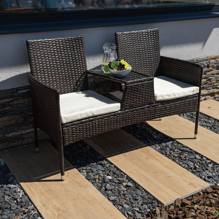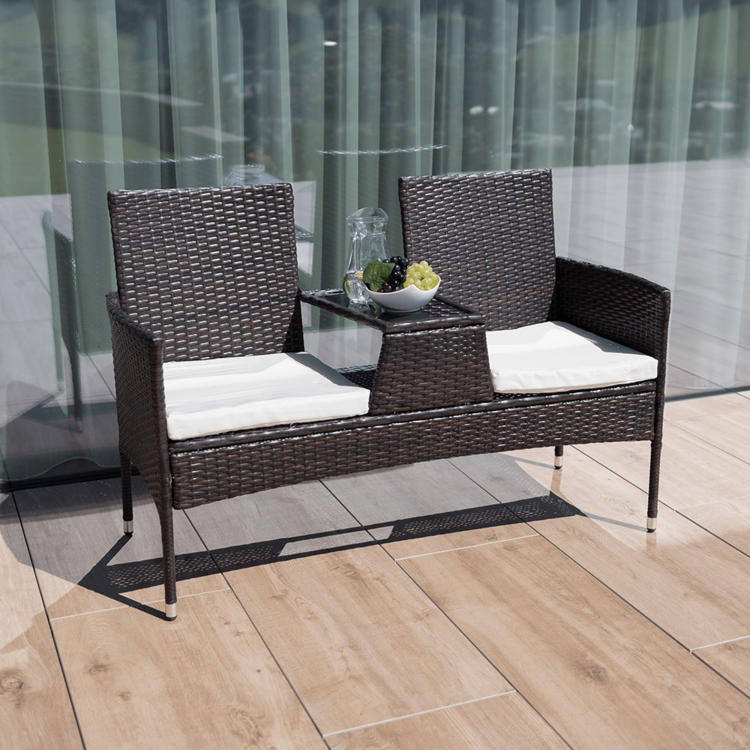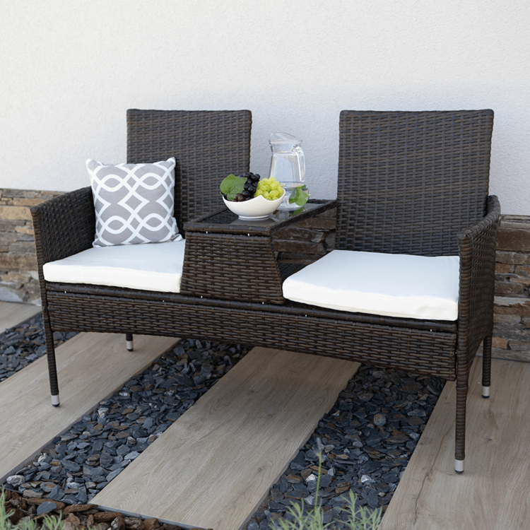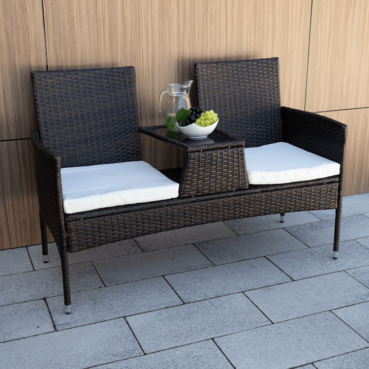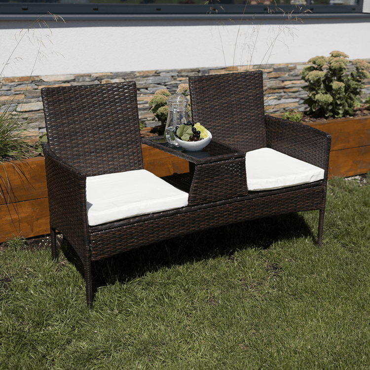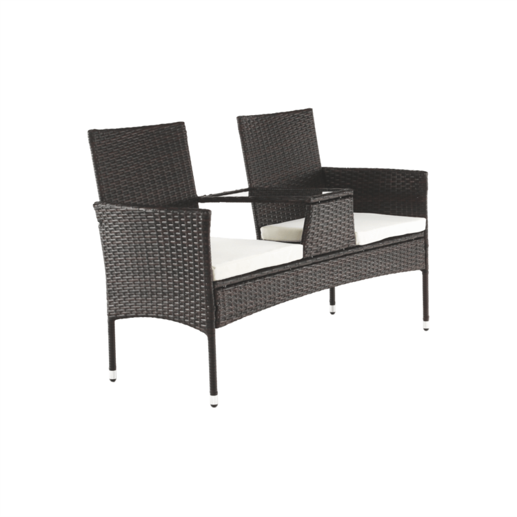 Vyrobený je z umelého ratanu v hnedej farbe. Elegantným ho robia aj vankúše v krémovej farbe, poťah je snímateľný a vodoodolný. Toto ale nie je všetko, čo Lalit ponúka. V strede tohto 2-sedu je stolík s vrchnou doskou z tvrdeného skla, ktorý sa ochotne podujme podržať vašu šálku kávy, alebo pohár vínka.