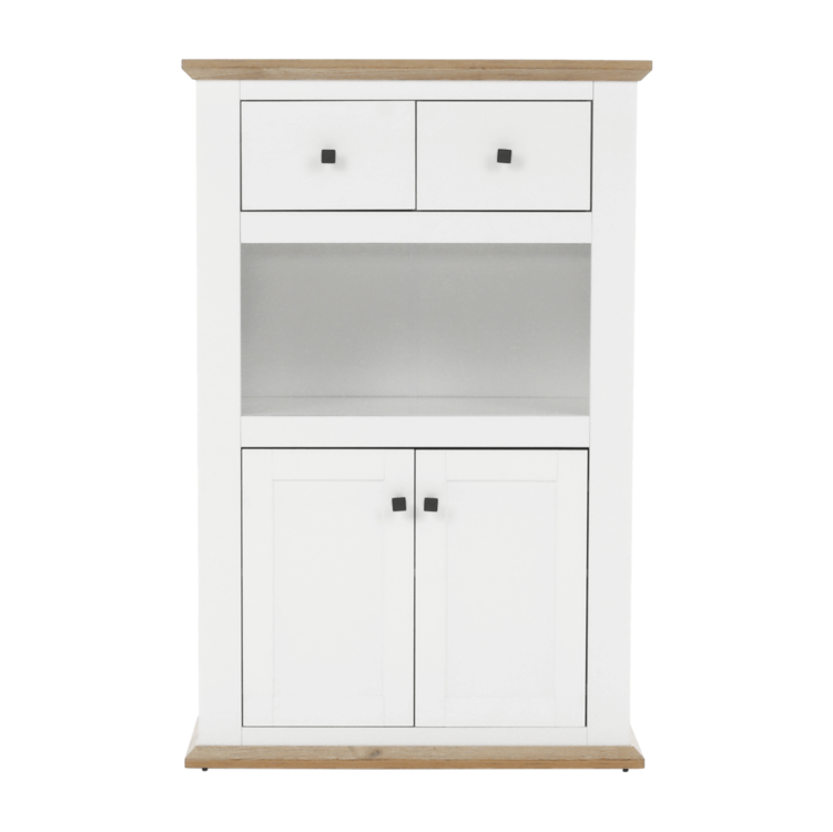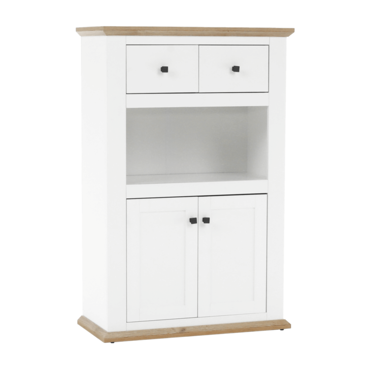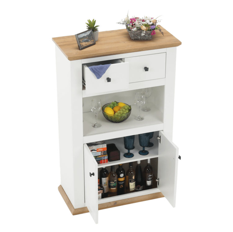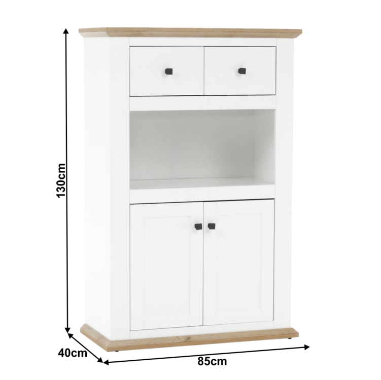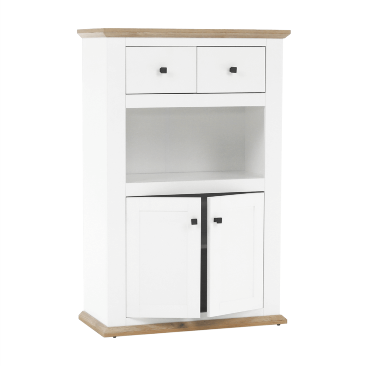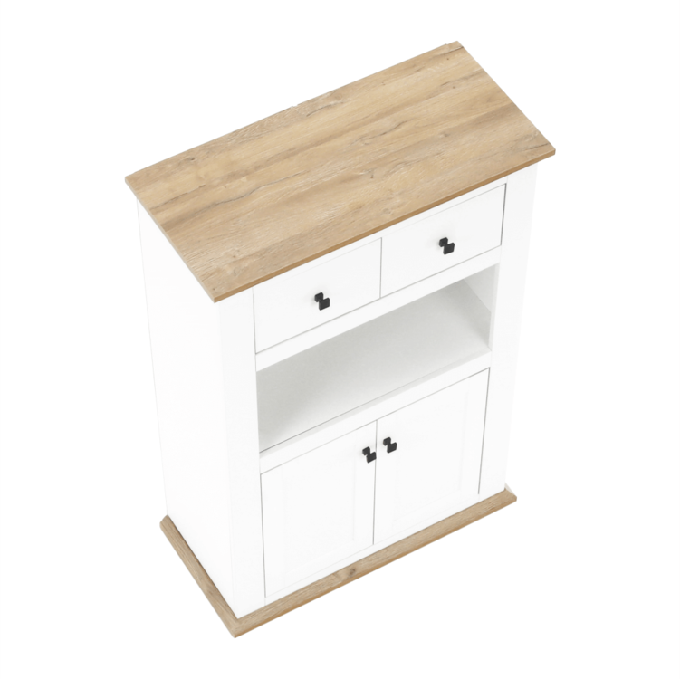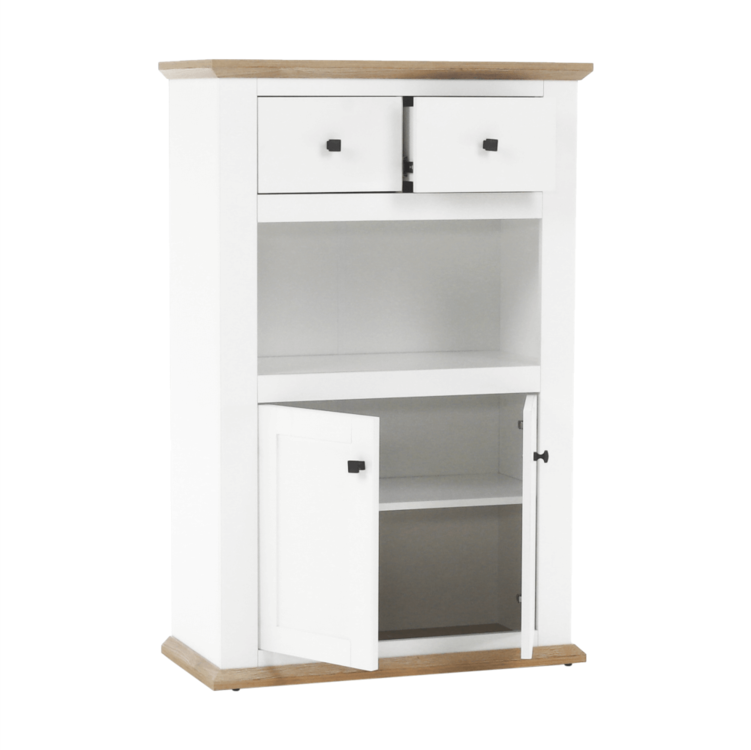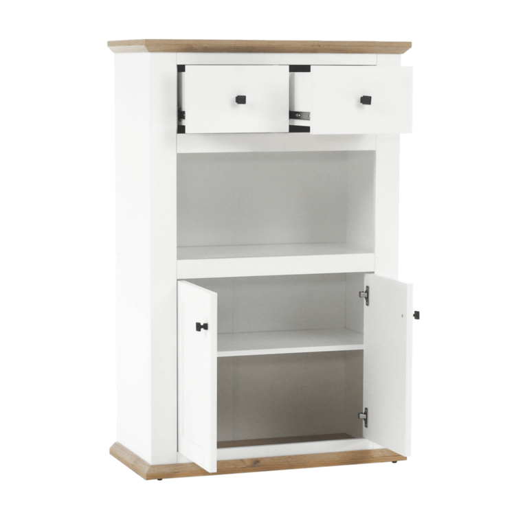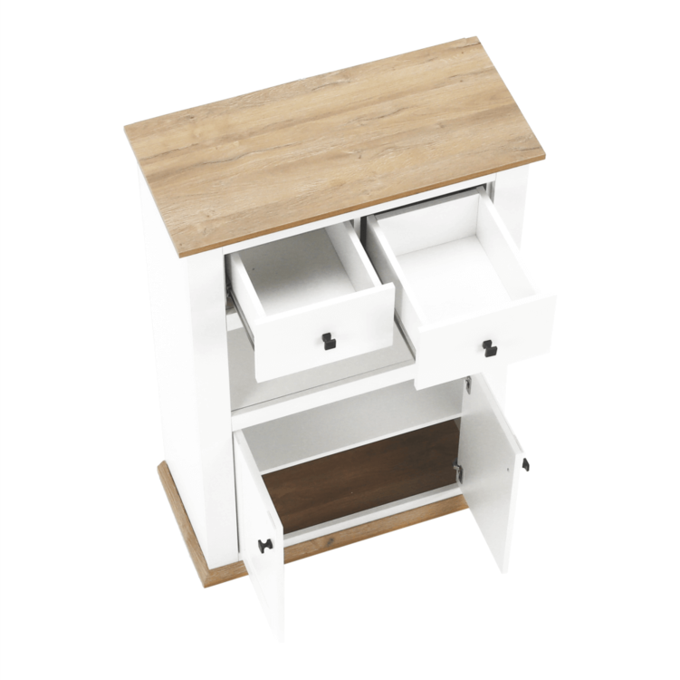 Disponuje úložným priestorom v podobe dvoch šuplíkov, dvoch skriniek a otvoreného úložného priestoru.