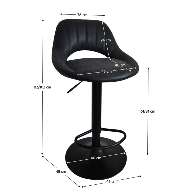 Kovová výškovo nastaviteľná noha vám umožní prispôsobiť si stoličku svojim potrebám a pohodliu. Čierna látka s efektom brúsenej kože.