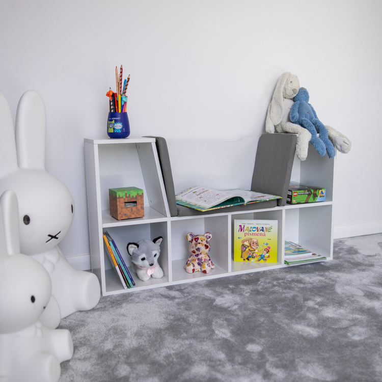 Vyrobená je z MDF laminovanej v sviežom bielom prevedení. Ponúka šesť políc, do ktorých si môže vaše dieťatko poukladať knihy podľa seba. Veľkým plusom je miesto na sedenie vložené do tejto knižnice. Tri látkové vankúše v sivej farbe prispejú na pohodlí pri čítaní. S knižnicou Feria vytvoríte vášmu pokladu kútik, kde si kedykoľvek môže sadnúť a samé sa vzdelávať.