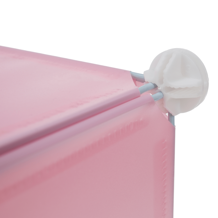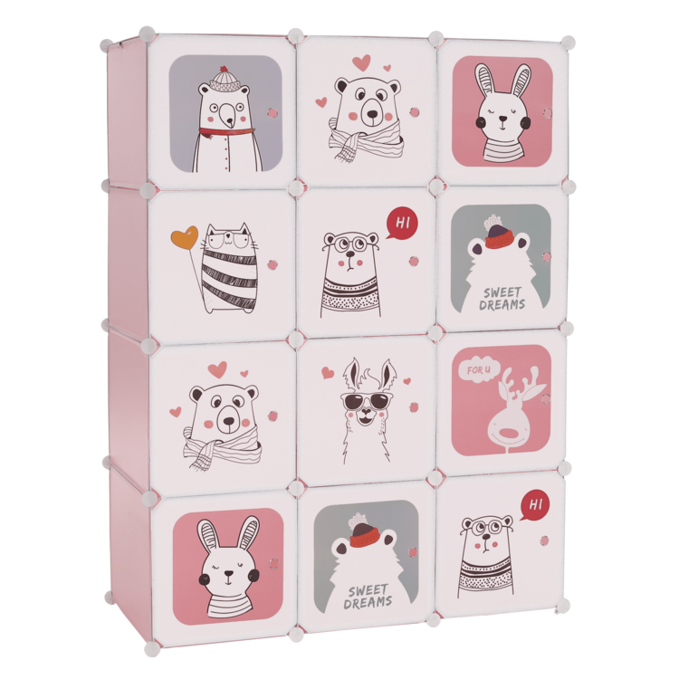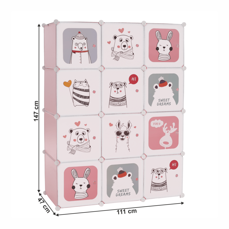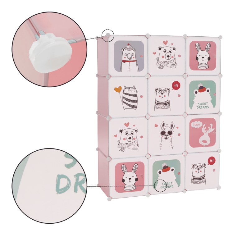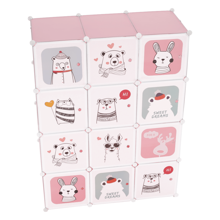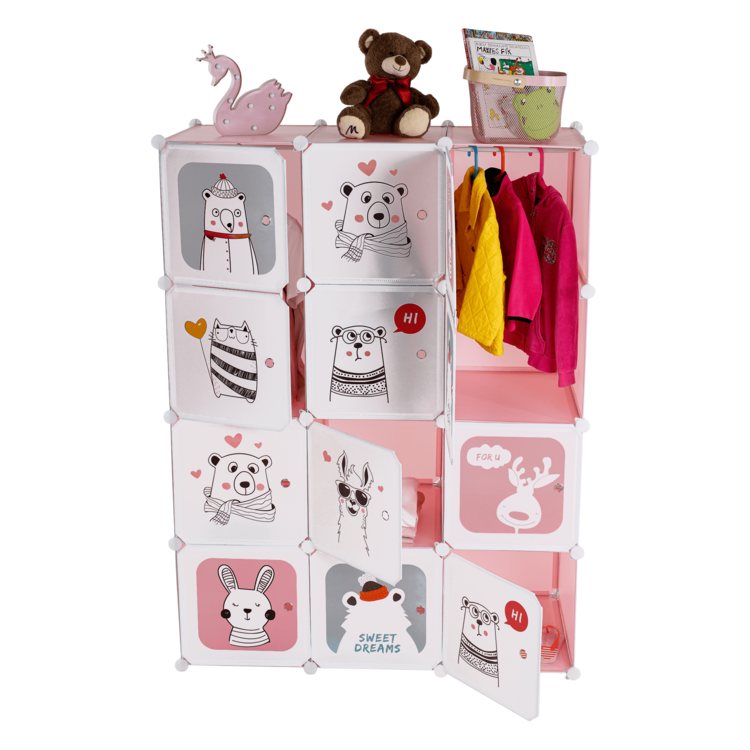 Skriňa NURMI je modulárna, vďaka čomu si ju viete poskladať podľa Vašich aktuálnych potrieb a predstáv. Je tvorená kovovou konštrukciou, doplnenou plastovými úložnými boxmi s nosnosťou 5kg a závesným systémom. Súčasťou balenia je aj vešiaková tyč. Skriňa má ružovú farbu a dvierka sú pokryté pestrofarebnými detskými motívmi.