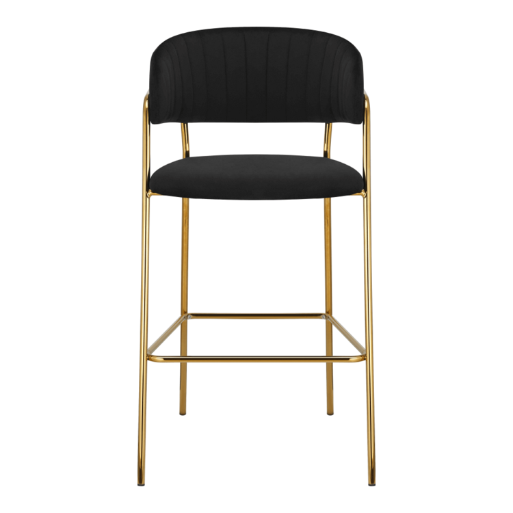 Vďaka spojeniu kombinácie Velvet látky v čiernej farbe a chrómu na vysokej konštrukcii v prevedení gold zlatý sa z nej stáva štýlová a elegantná barová stolička. Vhodná nielen do kuchyne, jedálne alebo kaviarne, či reštaurácie. Na komforte sedenia sa podieľa prešívané operadlo a opierky na ruky.