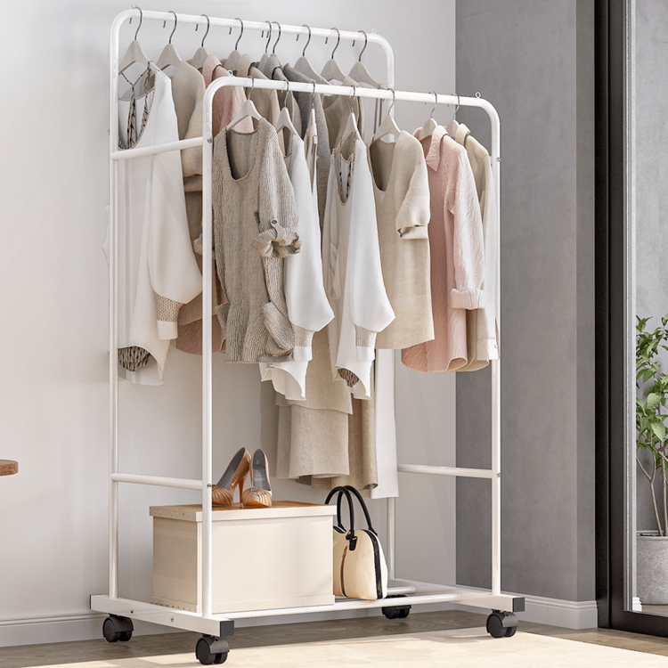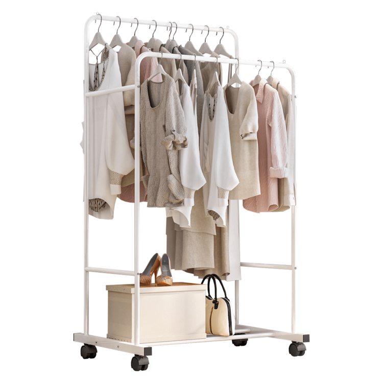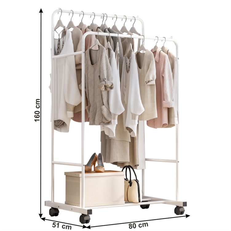 Dvojradový vešiak ponúka dve tyče pre zavesenie oblečenia na ramienkách. V spodnej časti nesmieme prehliadnuť policu, ktorá poslúži na topánky, doplnky uložené v boxoch, ale aj na kabelky. Konštrukcia je pevná, vyrobená z kovu v bielom prevedení. Jednoduchú manipuláciu pri presune zabezpečia kolieska, dve z nich majú brzdiaci systém.