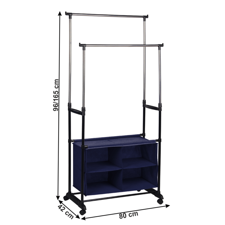 Vyrobený je z nehrdzavejúcej ocele a plastu v kombinácií farieb strieborná a čierna. Dve vešiakové tyče využijete na zavesenie košieľ, šiat, ale aj iného oblečenia. V spodnej časti sa nachádza látkový box rozdelený na štyri komory. Vďaka kolieskam stojan ľahko premiestnite, kdekoľvek to bude potrebné.