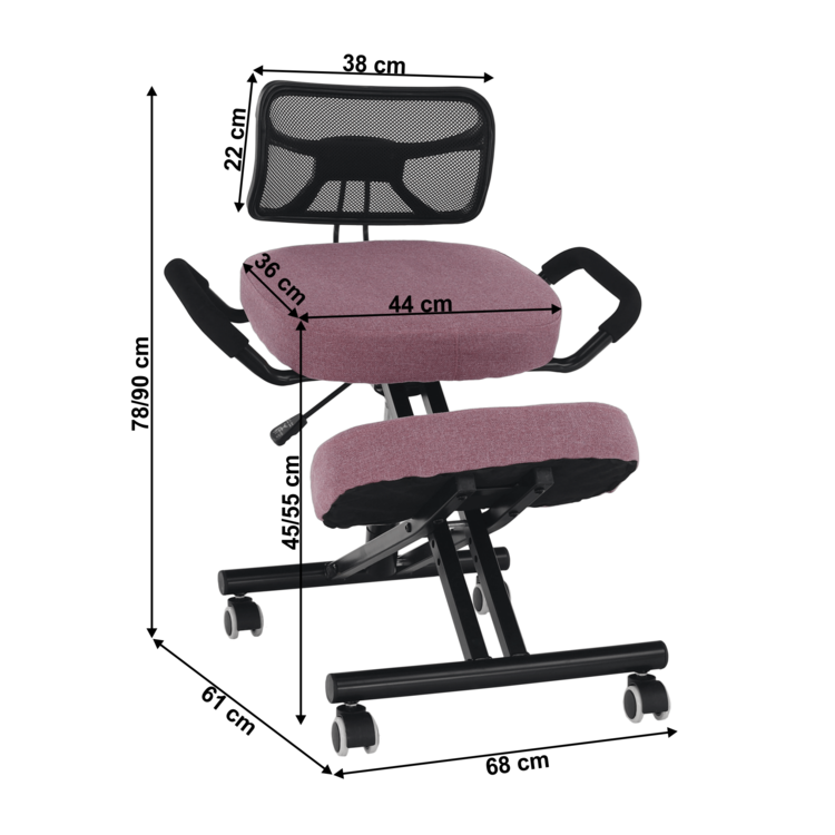 Ergonomická kľakačka RUFUS, vďaka ktorej už dlhodobé sedenie pri písacom stole nebude také náročné. Materiály ako látka a kov zaručujú stabilitu a dlhú životnosť. Ružová farba v kombinácii s čiernou pôsobí veľmi trendovo. Ľahší pohyb zabezpečujú kolieska, ktoré dopĺňa guma. Preto aj chráni drevené a plávajúce podlahy pred nepríjemnými škrabancami. Z ďalších funkcií, ktoré povyšujú kľakosed na vyššiu úroveň, spomenieme nastaviteľnú výšku sedu a opierky na ruky. Oprite si unavený a namáhaný chrbát o bedrovú opierku, zmiernite tak tlak v chrbtici. S kľakačkou RUFUS sa vám bude pracovať ľahšie