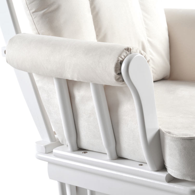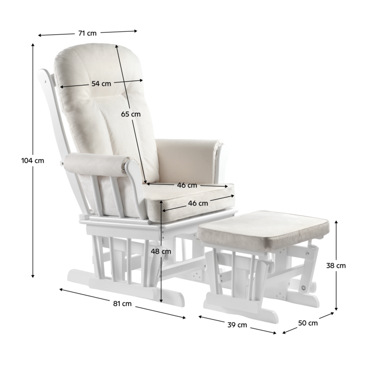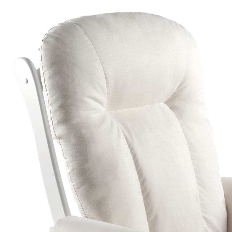 Vyrobené je z masívneho kaučukového dreva v bielom farebnom prevedení. O pohodlné opretie chrbta, sedenie a komfortné podloženie nôh sa postarajú vankúše v príjemnej krémovej farbe. Na vyplenenie bol použitý molitán. Poťah na vankúšoch nie je snímateľný a odporúčame ho čistiť len vlhkou handričkou. Výhodou kresla je hojdací mechanizmus zabezpečujúci jemné kývanie a relaxáciu. Zvýšiť komfort môžete vďaka podnoži, ktorá taktiež disponuje hojdacím mechanizmom ako kreslo.