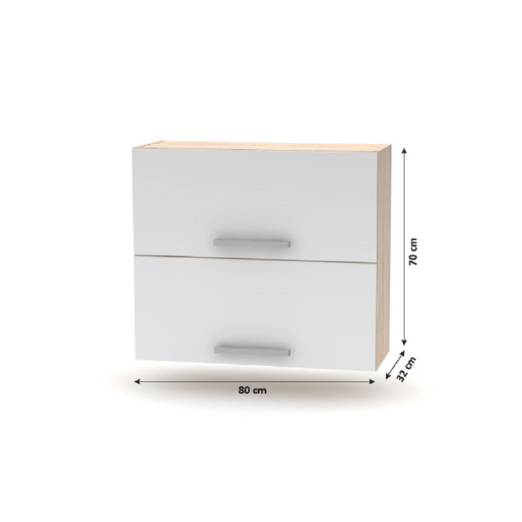 Horná výklopná skrinka 2DV, NOPL-015-VH Materiál: DTD laminovaná Farba: dub sonoma/biela Rozmery (ŠxHxV): 80x32x70 cm Hrúbka materiálu: 16 mm Kvalitný slovenský výrobok. Dodávané v demonte.