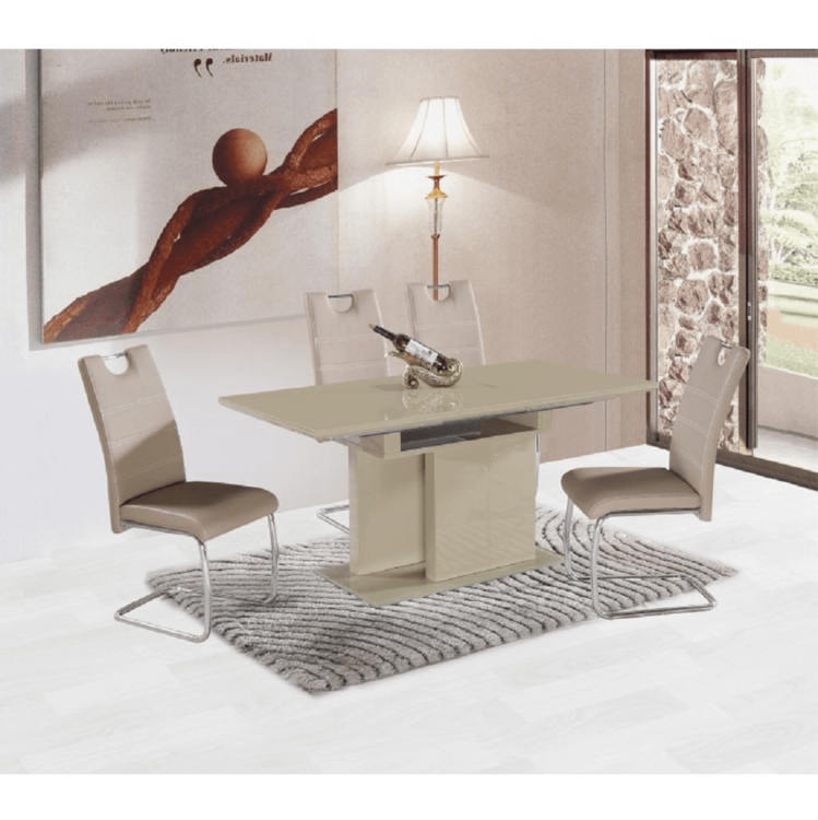 Jedálenský rozkladací stôl, v lesklom prevedení, zato v modernejšom, sviežom a oku lahodiacom farebnom odtieni capuccino. Originálny dizajn zmení vzhľad miestnosti na nepoznanie. Vyrobený je z pevného materiálu MDF a tvrdeného skla. Stôl je rozkladací a poskytuje dostatok miesta pre 4 až 6 stolujúcich.