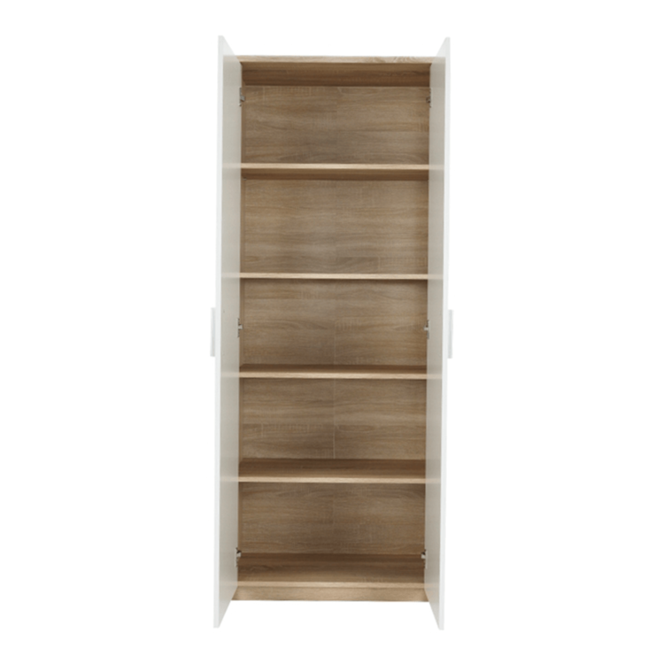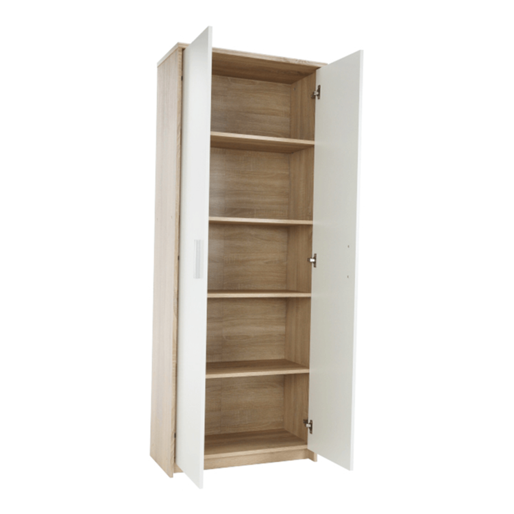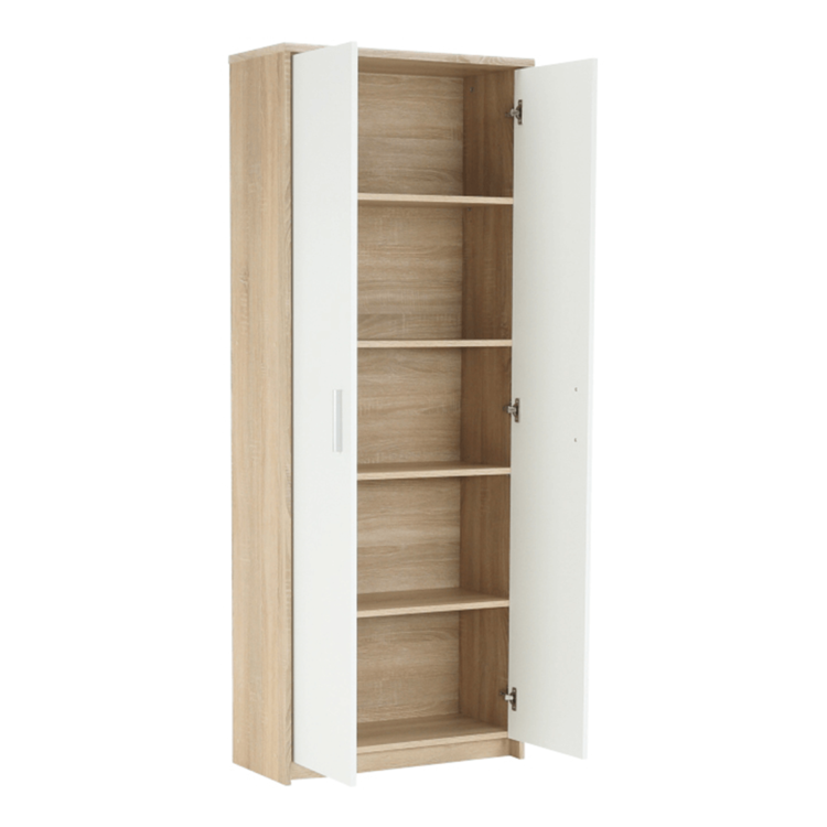 Do vysokej skrine sa zmestí množstvo vecí, ktoré potrebujete nejako usporiadať a zorganizovať. Chaos viac nebude súčasťou vašej kancelárie. Za dvomi dvierkami sa ukrývajú štyri police. Skrinku dodávame so spodným soklom. Na výrobu bola použitá kvalitná DTD laminovaná vo farebnom prevedení dub sonoma a biela.