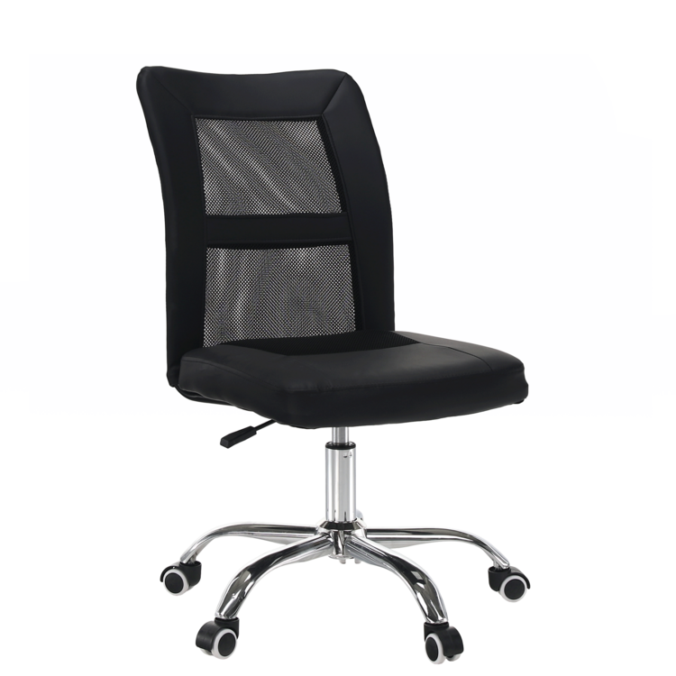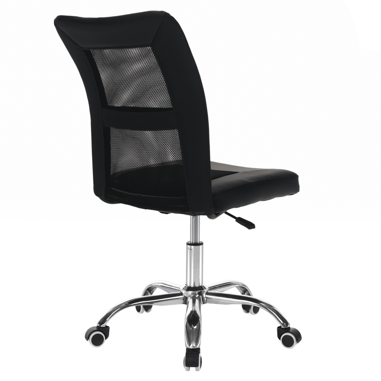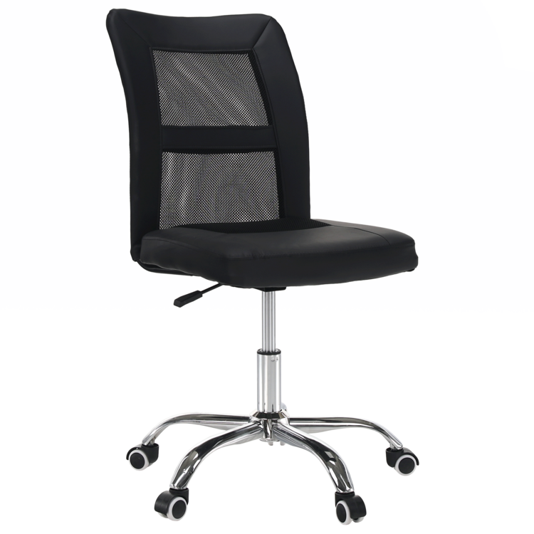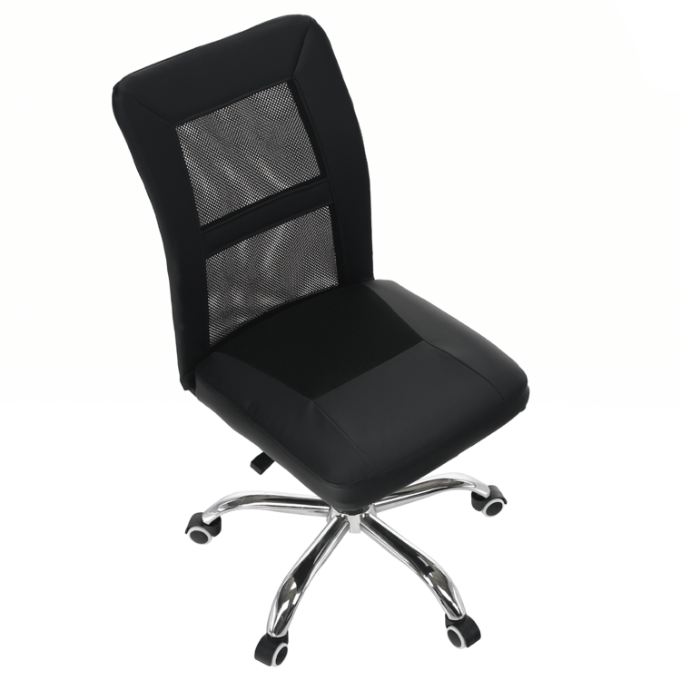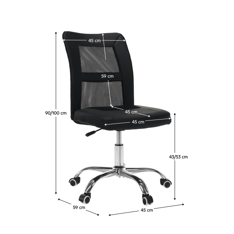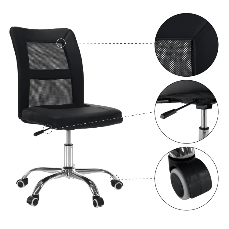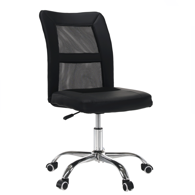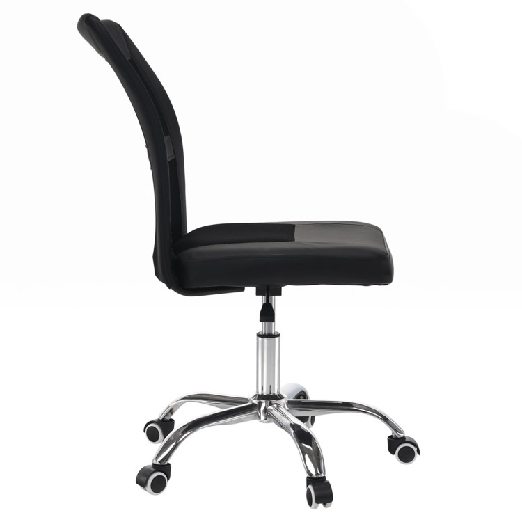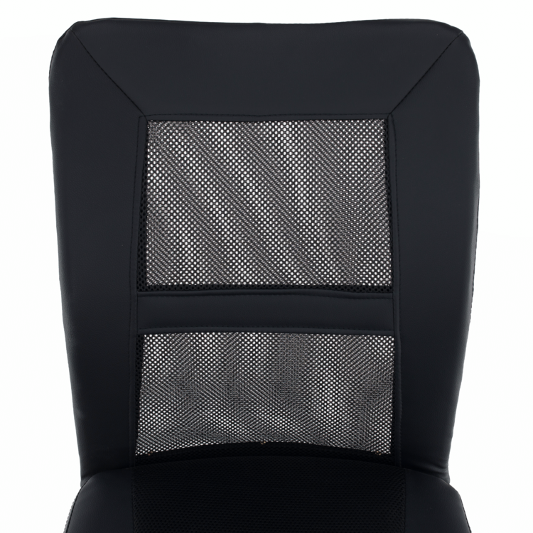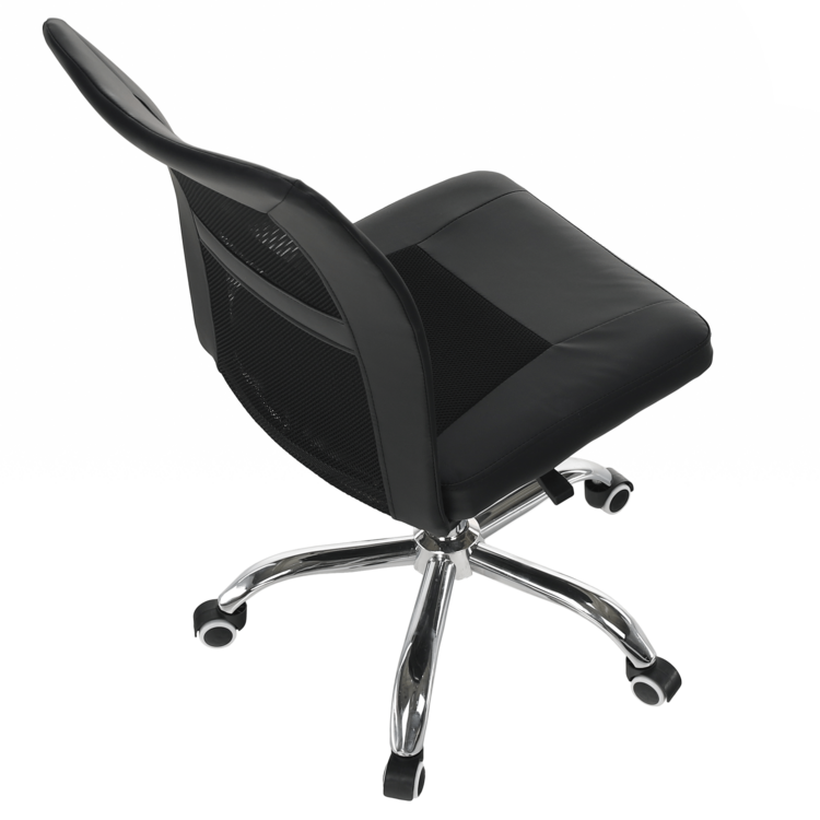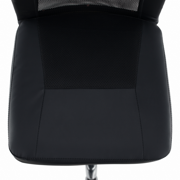 Kancelárske kreslo IDOR 2 NEW je vyrobené z kvalitného chrómu, čalúnené čiernou ekokožou a látkou a doplnené sieťovinovým výpletom. Mechanizmus na nastavenie výšky sedu je veľmi ľahko ovládateľný.