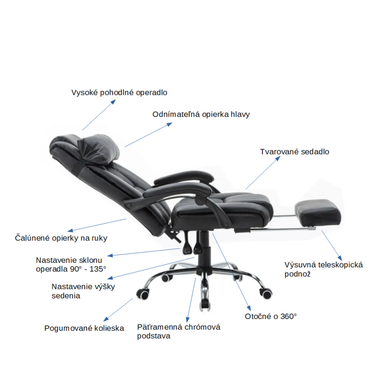Kancelárske kreslo ARNAUD 2 NEW je čalúnené čiernou ekokožou, ktorá je kvalitná a pôsobí dizajnovo. Konštrukcia je vyrobená z kovu a je ukončená univerzálnymi kolieskami, ktoré sú vhodné na tvrdé aj mäkké podlahy. K dispozícii sú polohovacie operadlo a výsuvná podnož. Podnož stačí vysunúť. Ak ju práve nepotrebujete, zasuňte ju pod sedadlo. Podnož nezaberá miesto a neprekáža. Kreslo má mechanizmus na nastavenie výšky sedu. Opierky na ruky sú plastové, čalúnené čiernou ekokožou.