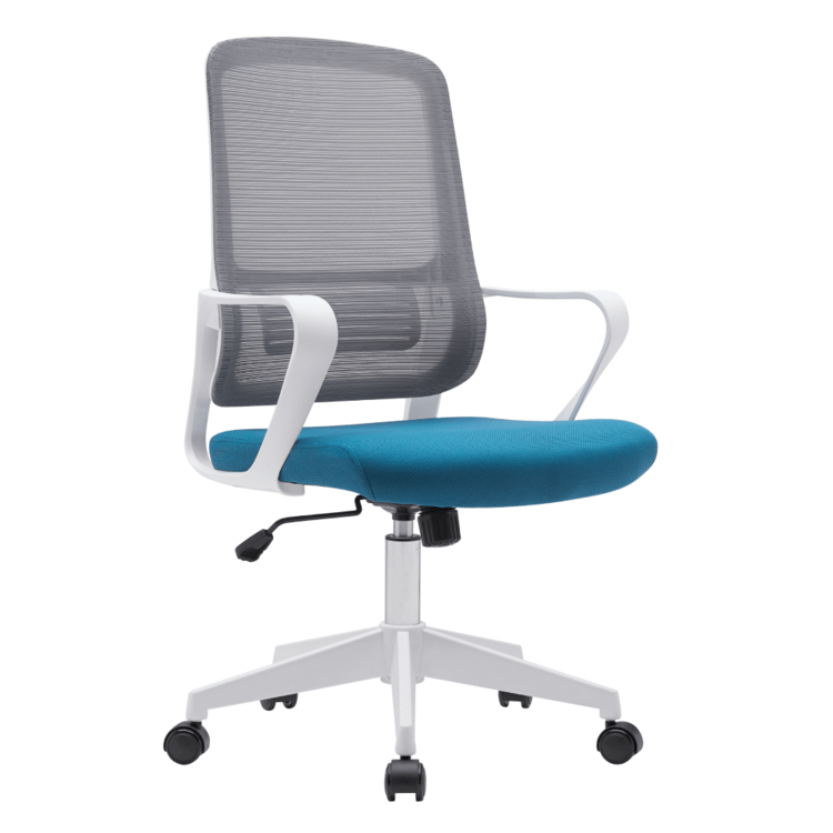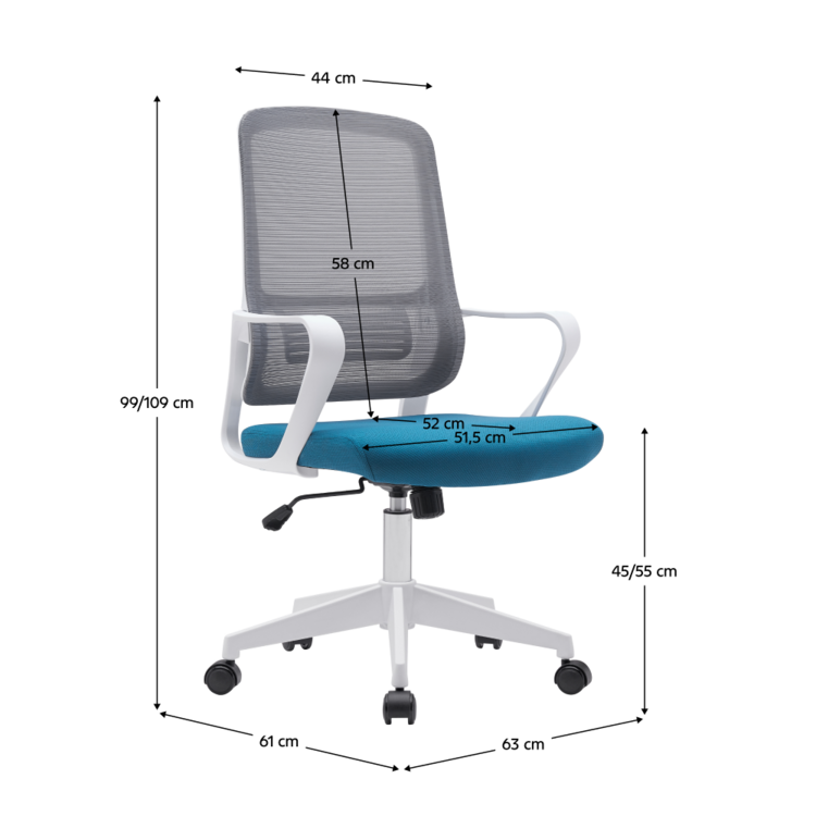 Vyniká nadčasovým dizajnom a viacerými funkciami. Disponuje mechanikou hojdania a funkciou nastavenia výšky sedu. Kreslo je čalúnené kombináciou sivej sieťoviny na operadle s petrolejovou látkou na sedáku. Podstava kresla je plastová v bielej farbe.