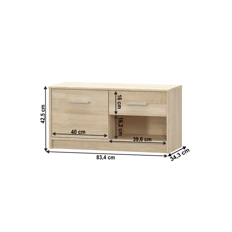 Vyrobená je z kvalitnej DTD laminovanej v prevedení dub sonoma. Ponúka bohatý úložný priestor v podobe jedného šuplíka, jednej skrinky a otvorenej police.