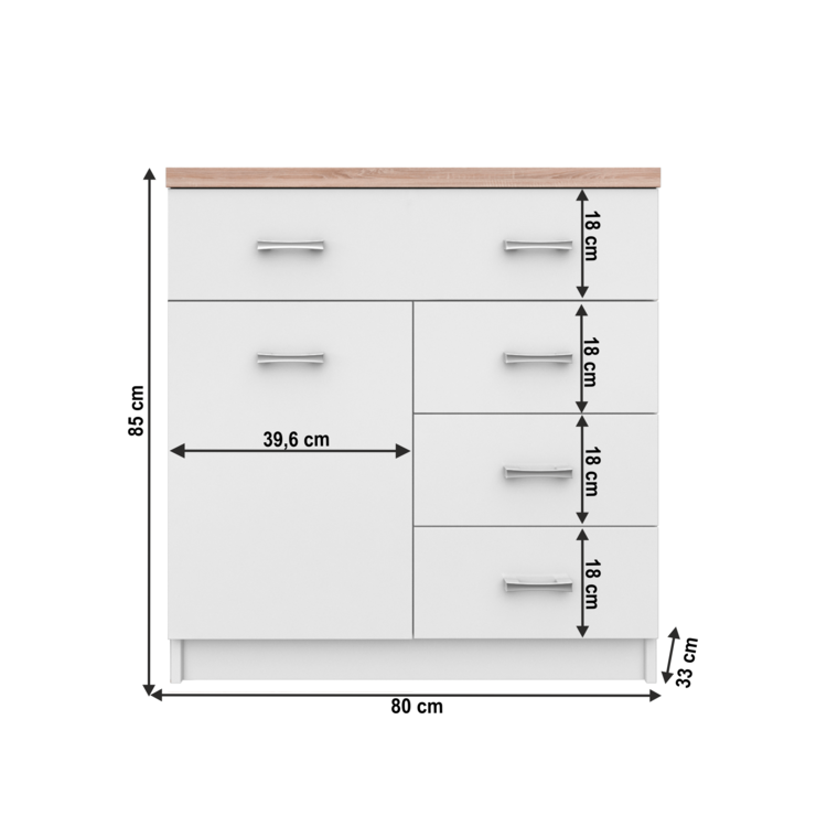 Komoda 1D4S TOPTY TYP 12 je ideálna na úschovu vecí. Má jednodverové dvierka, nad ktorými sa nachádza šuplík. Na pravej strane sa nachádzajú štyri rovnako hlboké šuplíky.