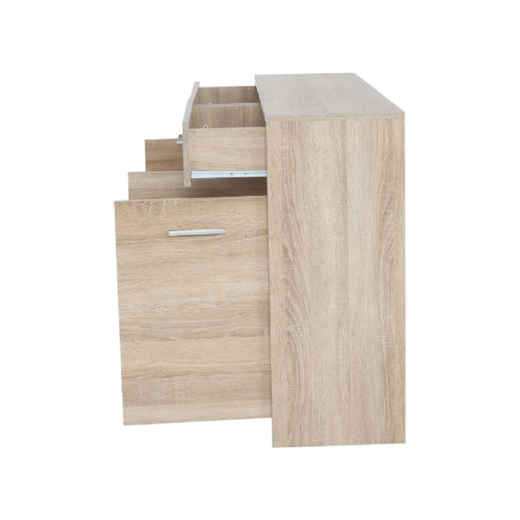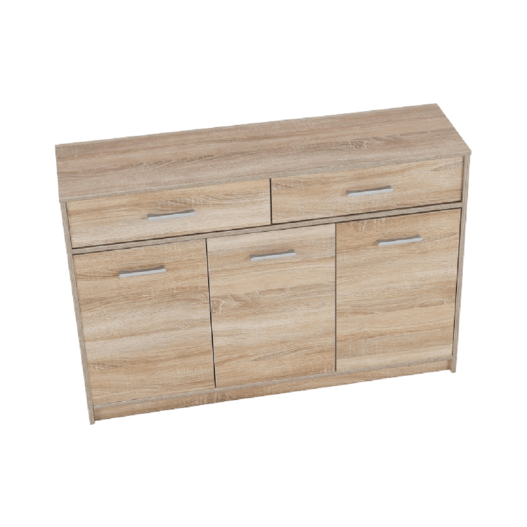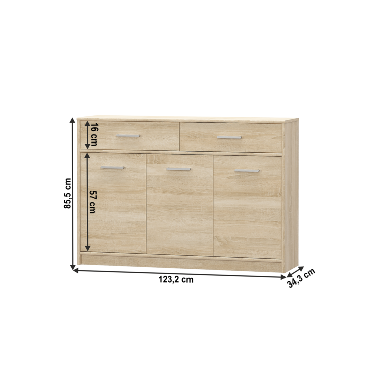Vyrobená je z kvalitnej DTD laminovanej v prevedení dub sonoma. Ponúka bohatý úložný priestor v podobe dvoch šuplíkov a skriniek s dvierkami.