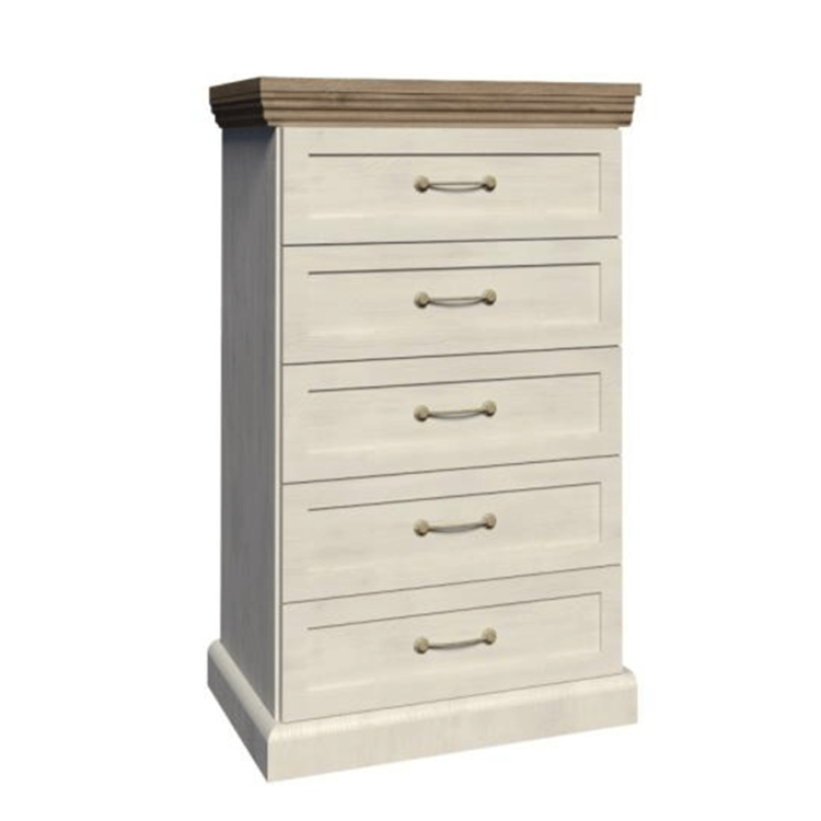 Komoda KS5 s piatimi šuplíkmi z elegantného sektorového systému Royal v provensálskom štýle. Vhodná na zariadenie obývacích izieb či spální.