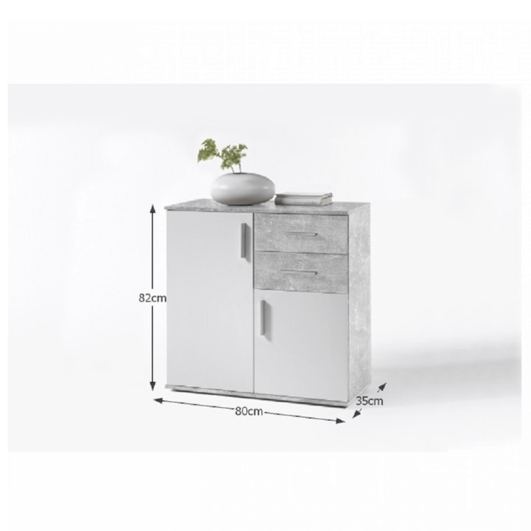 Je vyrobená z kvalitnej laminovanej DTD. Biela farba v kombinácii s prevedením betón, ktoré je v súčasnosti trendom. Komoda elegantne zapadne do každej spálne, obývacej izby či predsiene. Komoda je dvojdverová. Väčšia skrinka je policou rozdelená na dve odkladacie plochy, menšia skrinka je bez police. Nad ňou sú dva rovnako hlboké šuplíky.