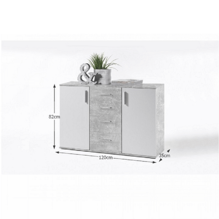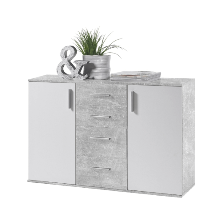 Je vyrobená z kvalitnej laminovanej DTD. Biela farba v kombinácii s prevedením betón, ktoré je v súčasnosti trendom. Komoda elegantne zapadne do každej spálne, obývacej izby či predsiene. Je dvojdverová. Skrinky sú policou rozdelené na dve odkladacie plochy. Súčasťou sú dva plytšie a dva hlbšie šuplíky.