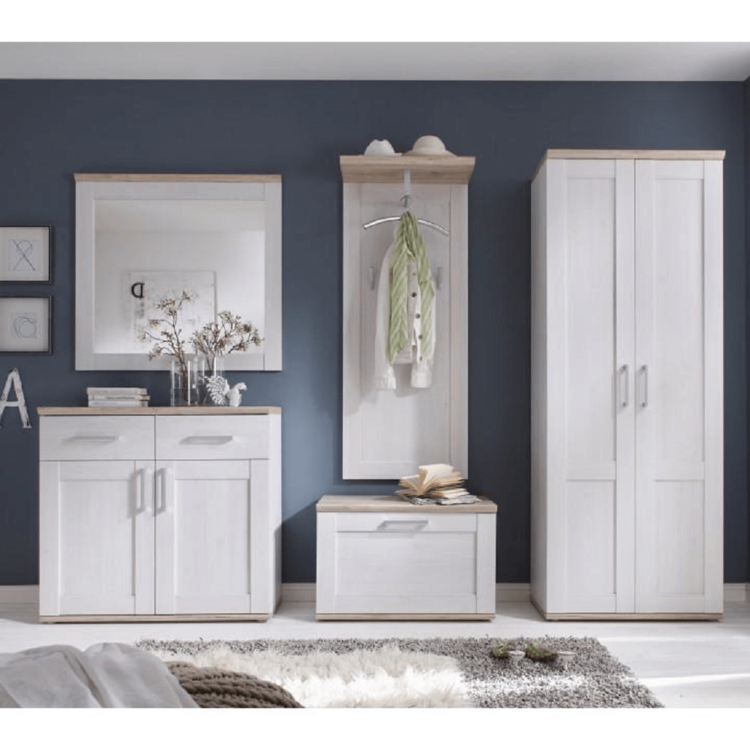 Jednoduché tvary ponorené v čistej bielej farbe, pričom vrchný a spodný diel sú v prevedení dub San Remo. Materiál je kvalitná fóliovaná drevotrieska, vďaka nemu vám komoda bude verným priateľom po dlhé roky.
