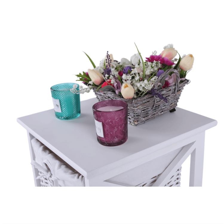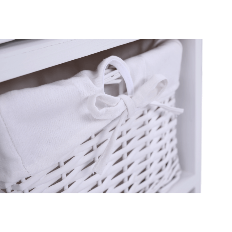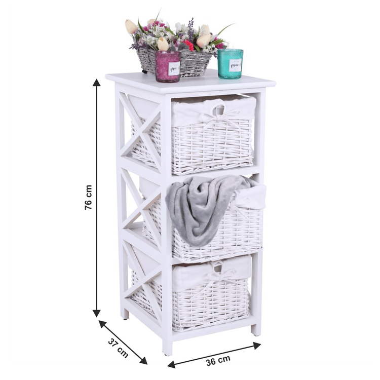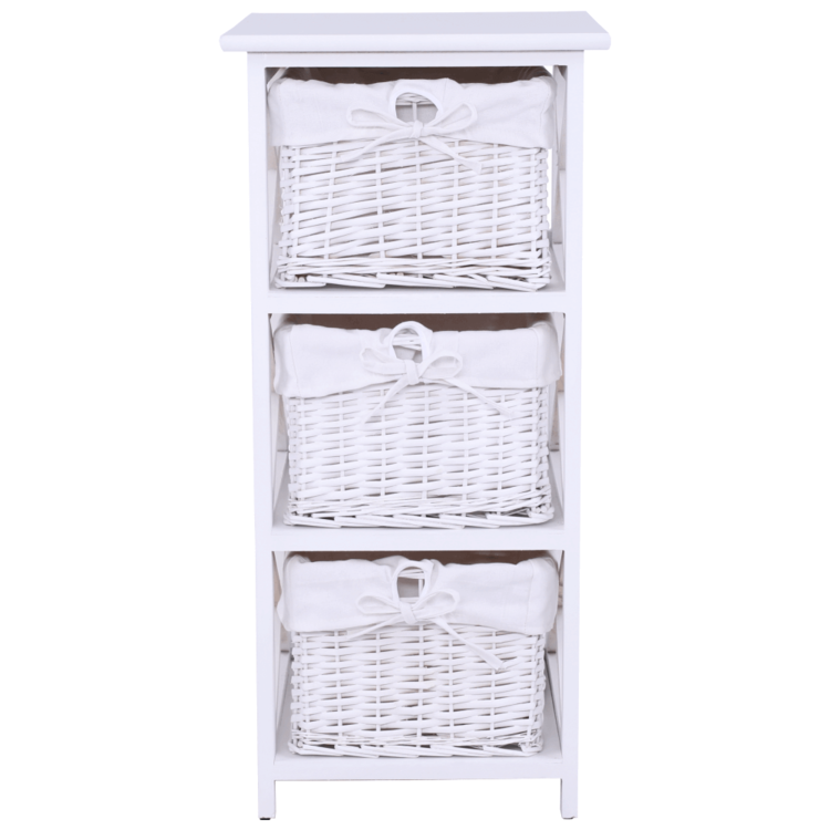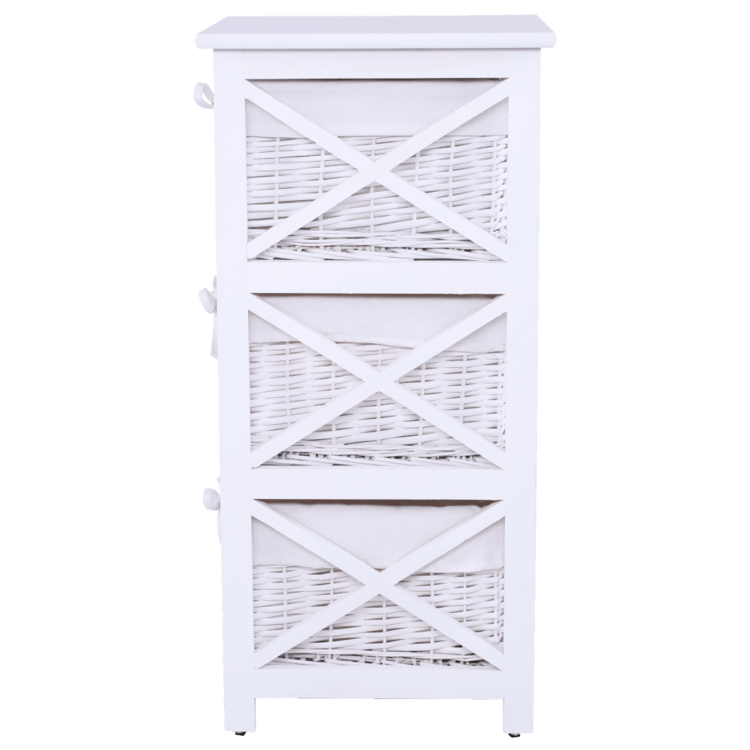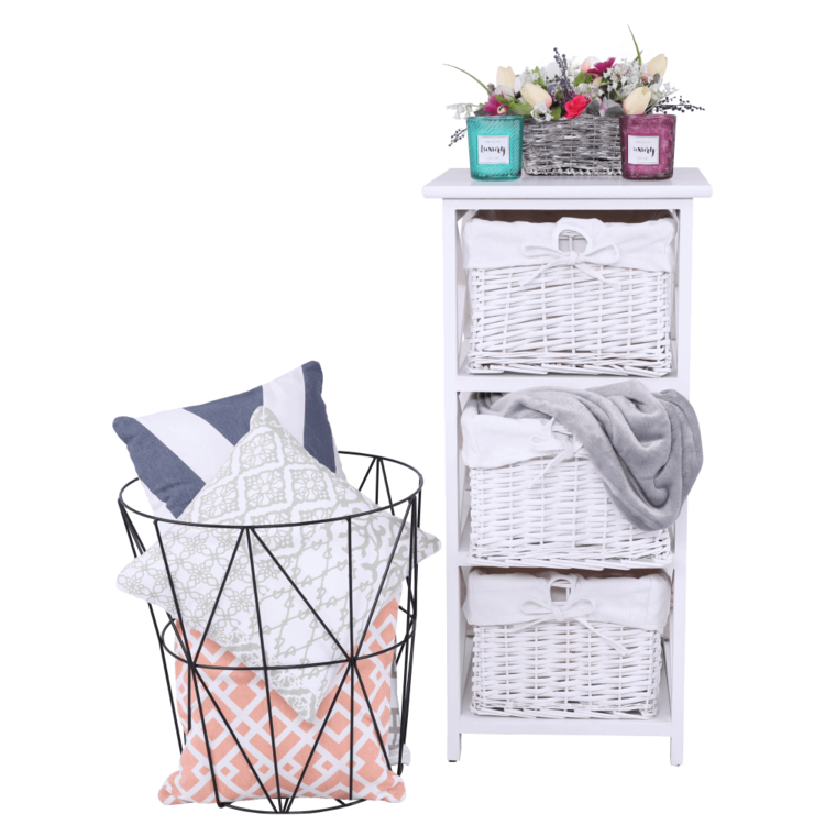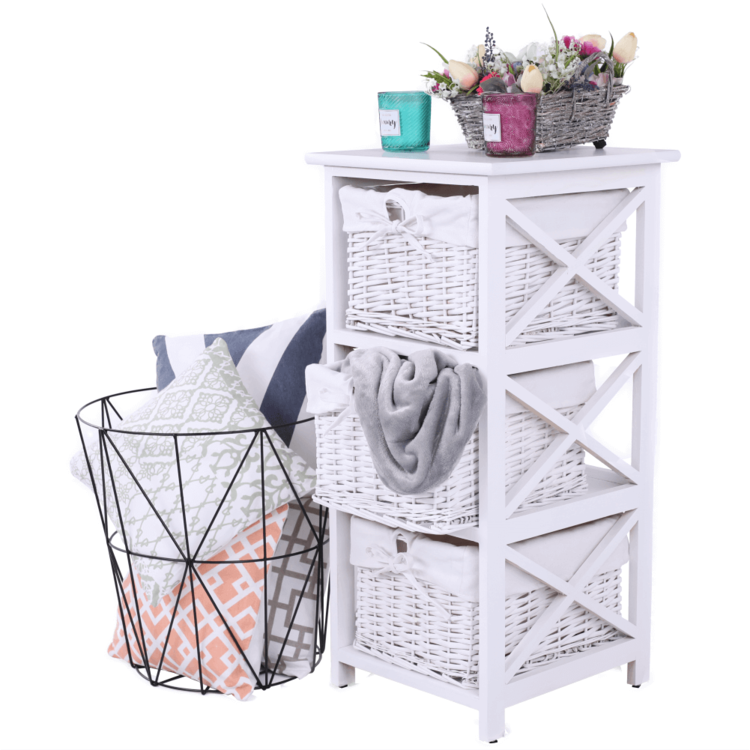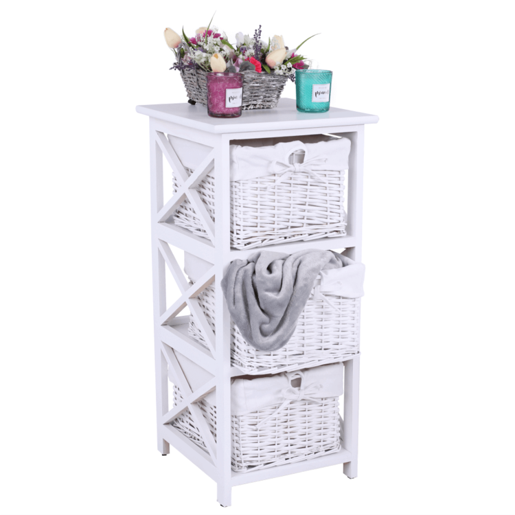 Komoda s tromi košíkmi RAFAELLO 3 s troma košíkmisi hravo odložíte veľa rôznych vecí. Vyrobená je z kvalitného prútia, látky a dreva.