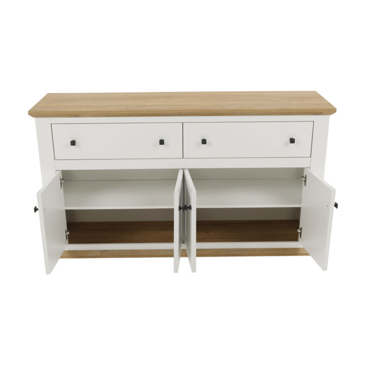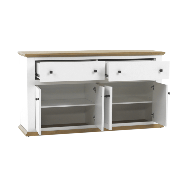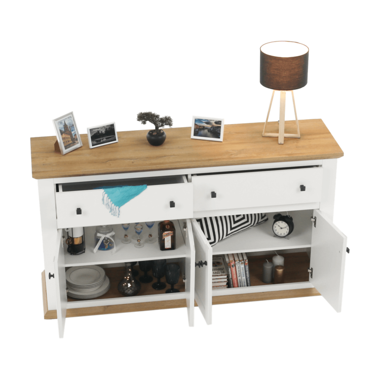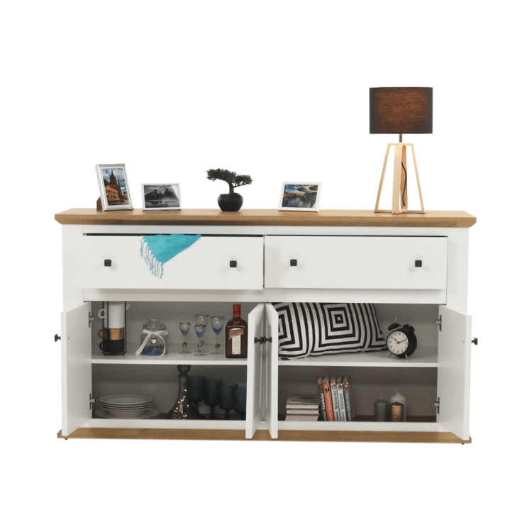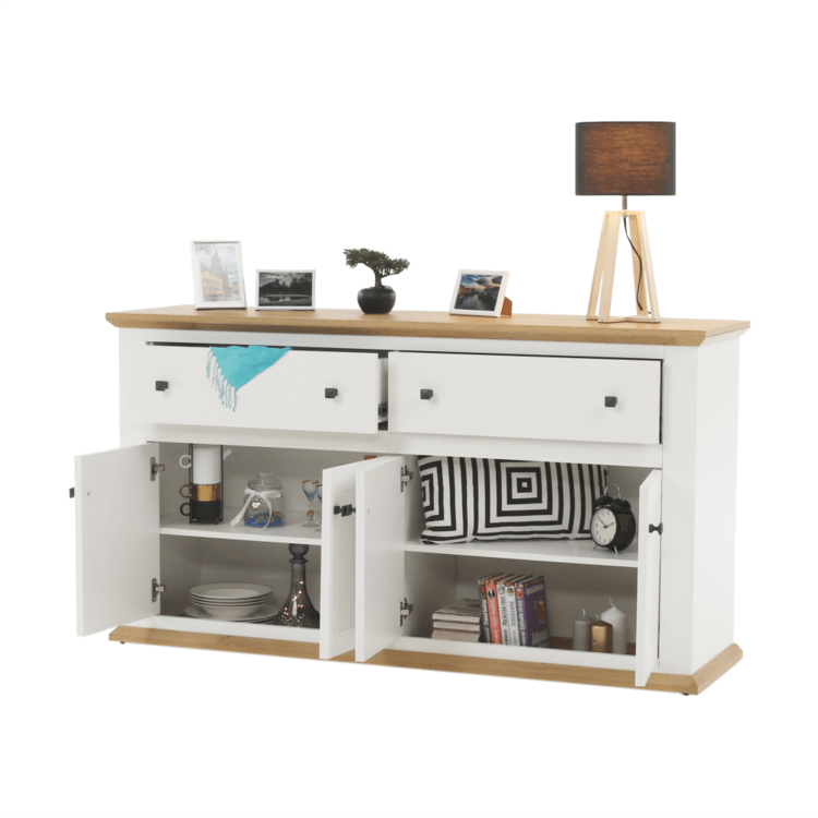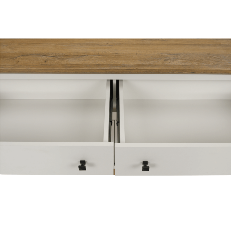 Disponuje úložným priestorom v podobe dvoch šuplíkov a štyroch skriniek.