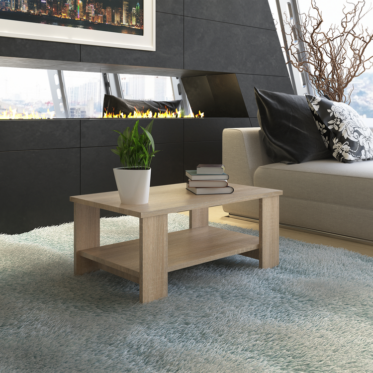 Jednoduché prevedenie dub sonoma oživí interiér a pridá mu na elegancii. Výhodou je úložný priestor v podobe jednej police, ktorý poskytuje odkladací priestor na časopisy, ovládače a pod. Je vyrobený z laminovaných drevotrieskových dosiek.