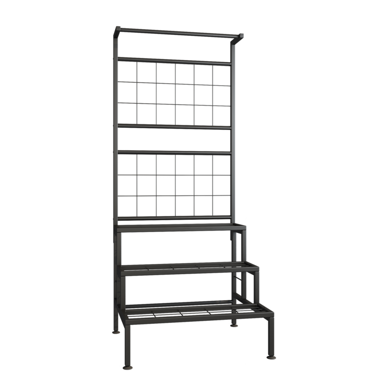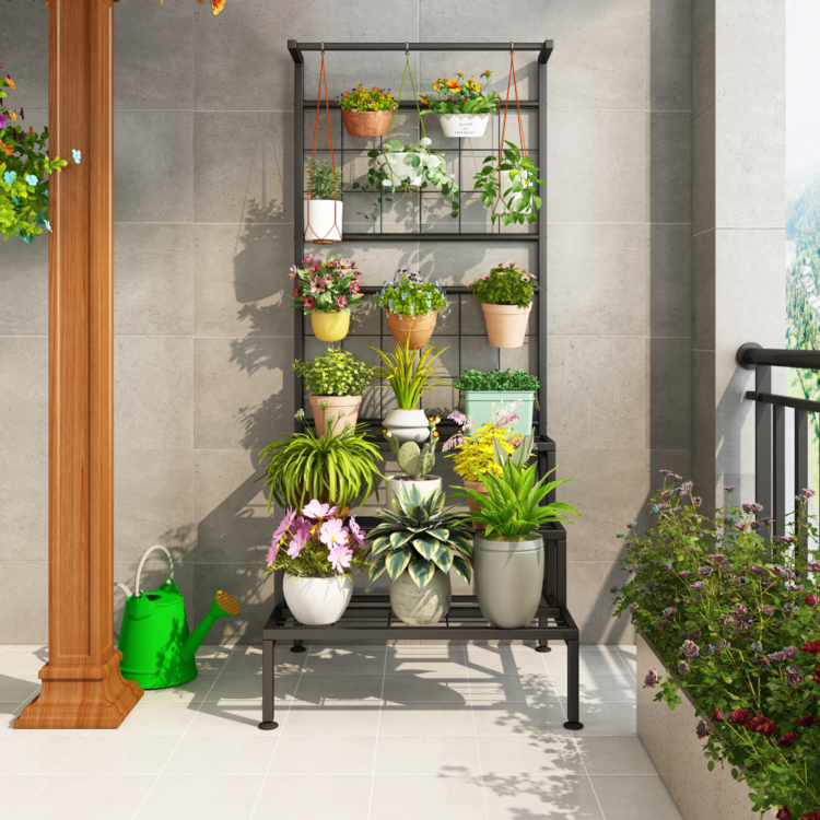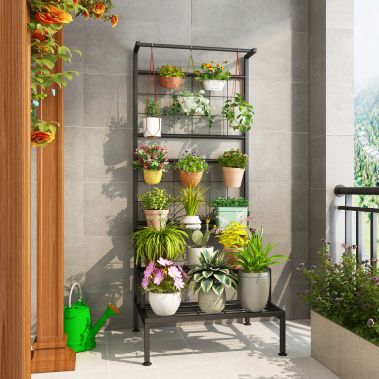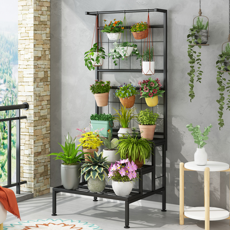 Vďaka svojej veľkosti a tvaru je stojan vhodný pre rôzne typy kvetov a rastlín. Poskytuje tri široké police, dve časti na zavesenie a jednu tyč, taktiež vhodnú na zavesenie. Konštrukcia je vyrobená z kovu v čiernej farbe.