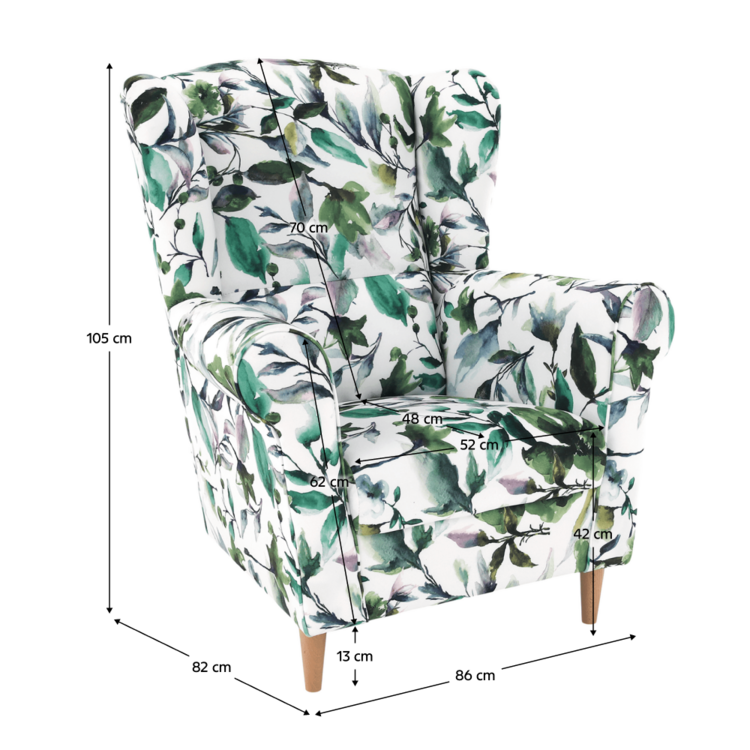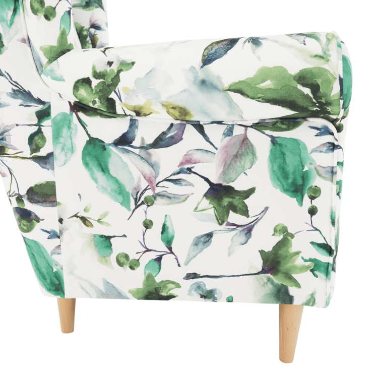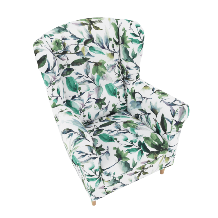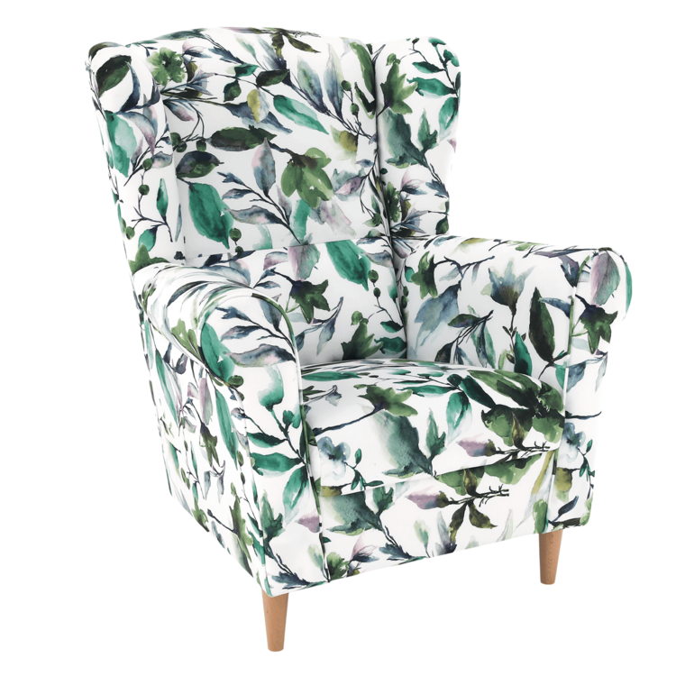 Opierka chrbta je vysoká až 70 cm a tvarovaná, a tak pomáha predísť bolestiam chrbtice a krku. Mohutné opierky rúk poskytnú relax vašim rukám. Užívajte si veľmi príjemné a pohodlné sedenie. Jadro je tvorené PUR penou, ktorá vyniká výbornými vlastnosťami. Na začiatku je tuhšia, no používaním sa stáva komfortnejšia bez toho, aby strácala na objeme. Kreslo CHARLOT ponúkame v prevedenílátky so vzorom zelené lístie. Stabilita kresla je zabezpečená vďaka dreveným nožičkámvo farebnom prevedení buk.