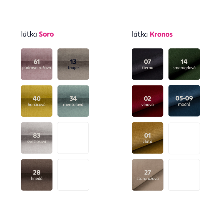 Možnosť objednania vo viacerých farebných prevedeniach látky Soro alebo látky Kronos, doba dodania 8-10 týždňov. Vami zvolené prevedenie je nutné vpísať do poznámky v objednávke.