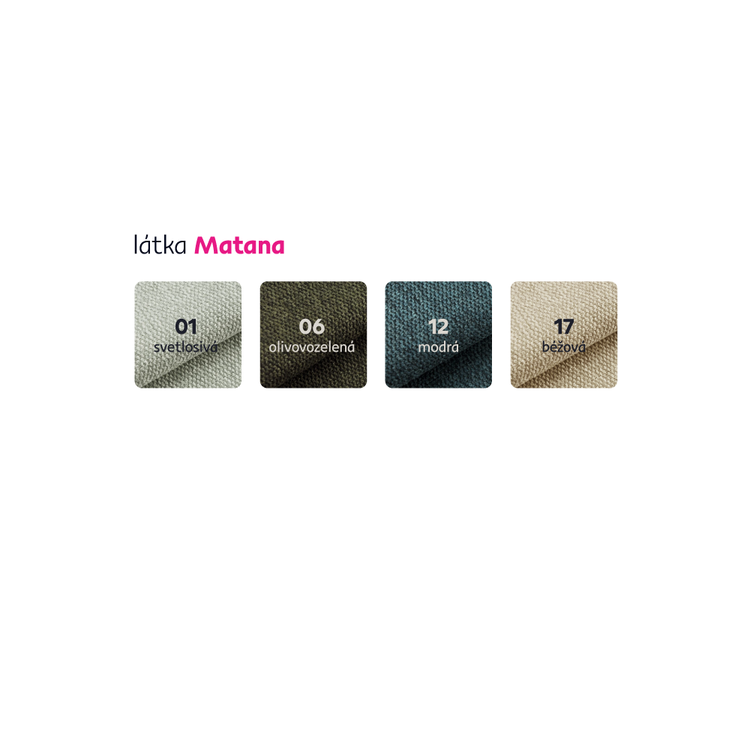 Možnosť objednať aj v inej farbe látky Matana. Odtiene nájdete v priloženom vzorkovníku. Výber farebného odtieňa poznačte pri objednávaní priamo do poznámky. Cena kresla sa v inom farebnom prevedení líši. Pri individuálnej objednávke je potrebné zaplatiť 10% zálohu z danej sumy. Po uhradení zálohy bude Vaša požiadavka zadaná do výroby. Dodacia doba 6-8 týždňov.