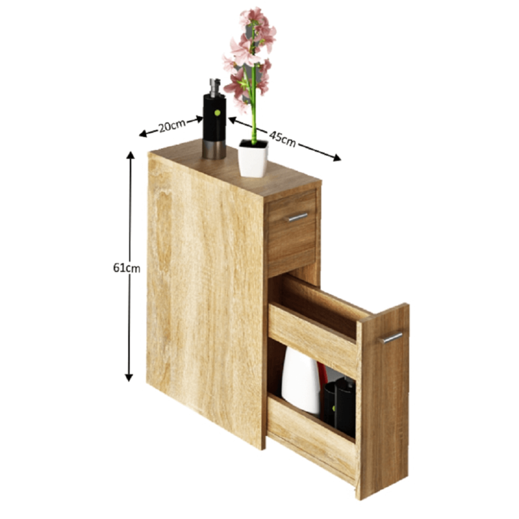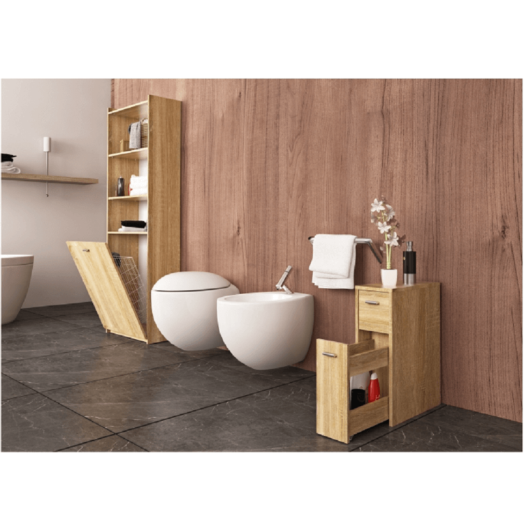 Kúpeľňová skrinka NATALI TYP 7 šetrí miesto, a zároveň poskytne odkladaciu plochu naviac. Ponúka uzavretý úložný priestor, čo ocení každá domácnosť. Skladá sa z jedného šuplíka a vysúvacej skrinky. Je vyrobená z DTD laminovanej vo farebnom prevedení dub sonoma. Ide o kvalitný slovenský výrobok.