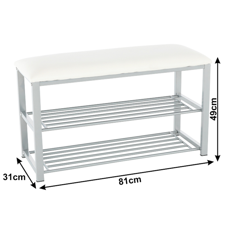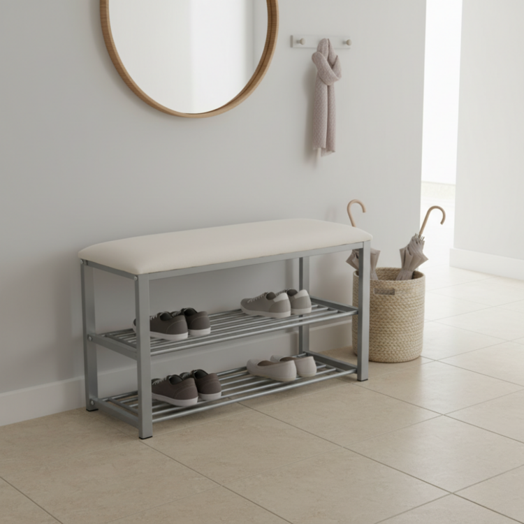 Botník, ktorý zároveň zastupuje nábytok poskytujúci miesto na sedenie. Vyrobený je z kvalitného kovu v sivej farbe a čalúnený látkou vo farebnom prevedení béžová. Viac vás nemusí trápiť otázka, kam odložíte svoje topánky a topánky vašej návštevy.Dve kovové police vám zabezpečia dostatok úložného priestoru. Funkciu sedenia, ktorú botník ponúka, ocenia predovšetkým deti a staršie osoby.