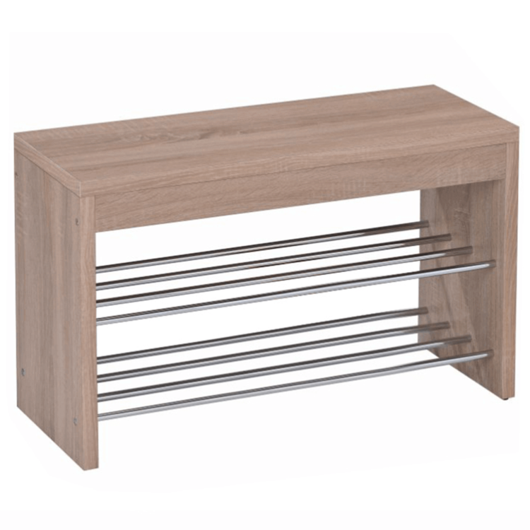 Lavica s botníkom LUSIA, obsahuje dve kovové poličky na topánky, poskytuje tiež miesto na sedenie, čo je veľmi praktické. Vyrobená je z MDF v prevedení dub sonoma, poličky sú kovové.