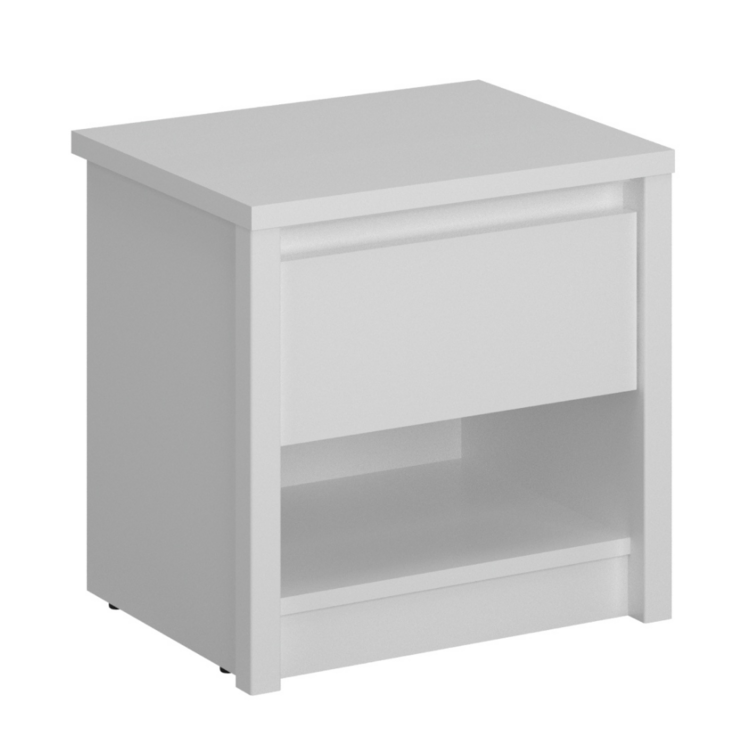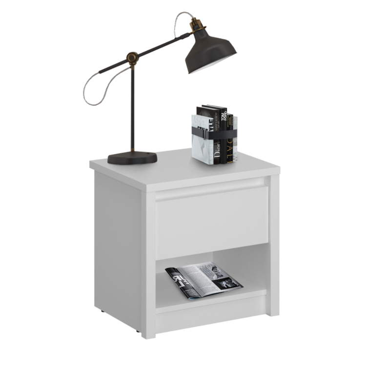 Biely nočný stolík 1S ERODIN bude krásnym doplnkom do vašej spálne či študentskej izby. Poskytuje dostatok úložného priestoru v podobe jedného šuplíka a otvoreného úložného priestoru. Minimalistický nočný stolík vyniká svojim praktickým využitím.