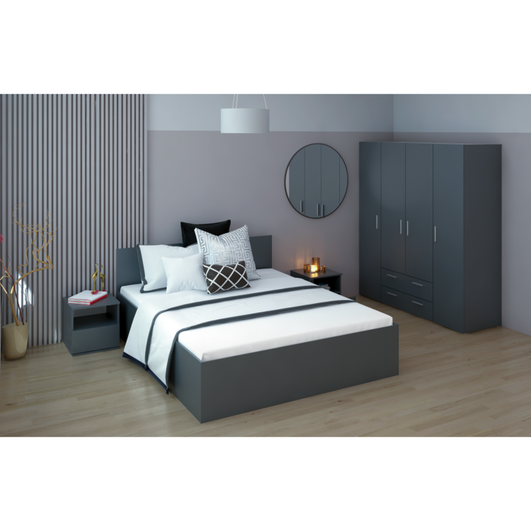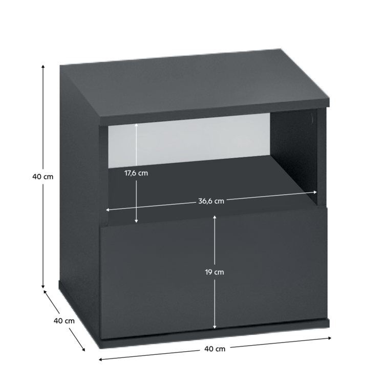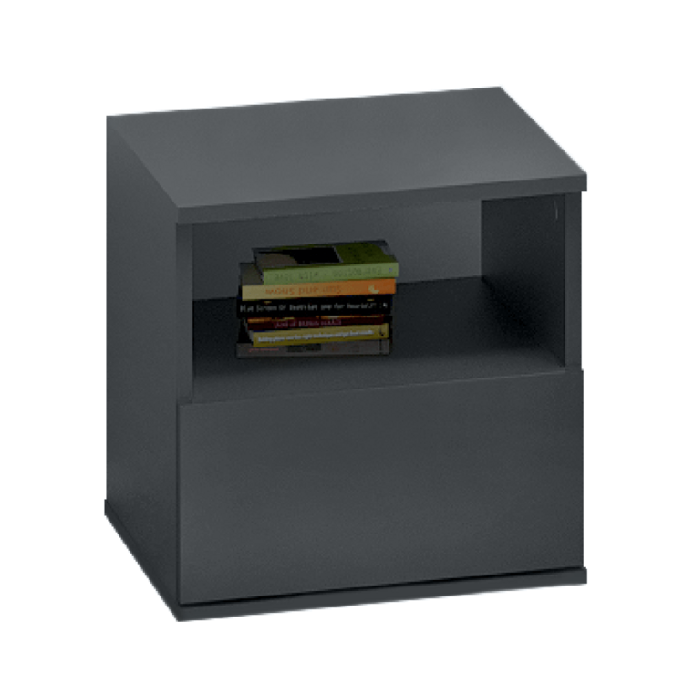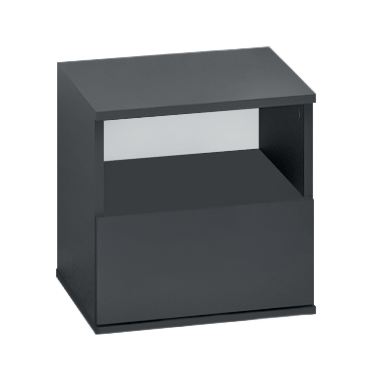 Stolík obsahuje zásuvku a otvorený úložný priestor na uskladnenie osobných vecí, ako sú knihy, okuliare, budík či lampička. Vyrobený je z laminovanej DTD vo farebnom prevedení grafit.