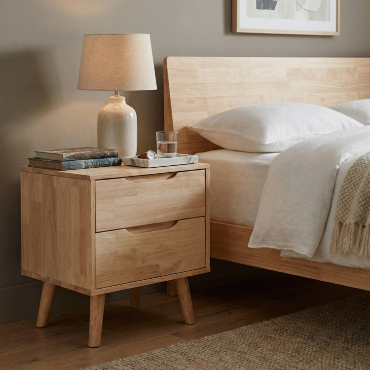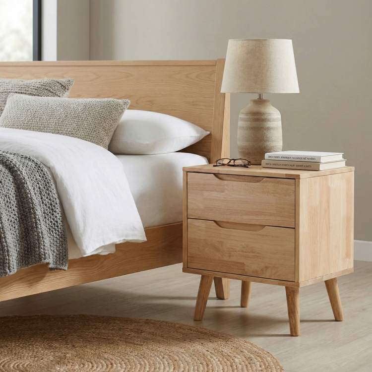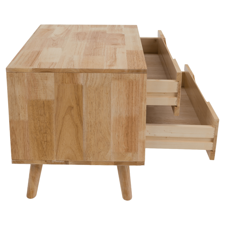 Ponúka dostatok úložného priestoru v podobe dvoch šuplíkov. Jeho povrch viete prakticky využiť na umiestnenie lampy, dekoratívnych prvkov alebo predmetov, ktoré chce mať vždy poruke. Vyrobený je kombináciou odolného a pevného kaučukového dreva na ráme a nožičkách stolíka a z borovicového dreva na šuplíkoch. Všetko v prírodnom prevedení. BRUNI neobsahuje klasické úchytky, avšak manipuláciu so šuplíkmi uľahčujú zafrézované úchytky. Stabilitu stolíka zabezpečujú vysoké nožičky.