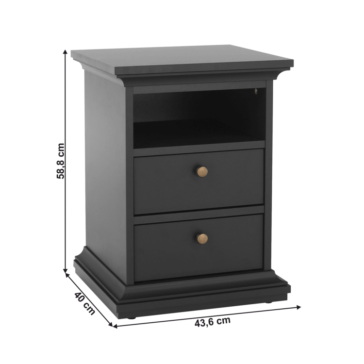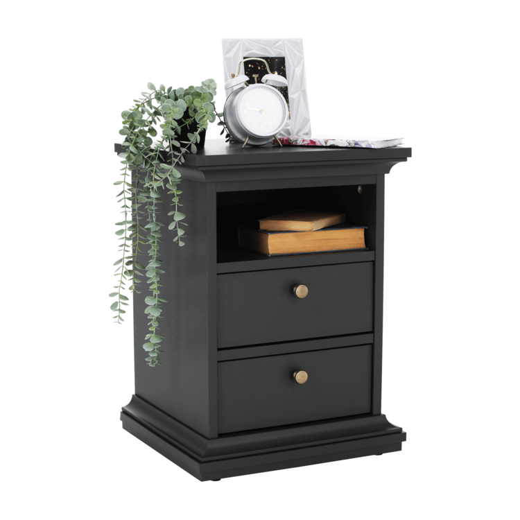 Nočný stolík PARIS 70302 ponúka dostatok úložného priestoru. Tvoria ho dva šuplíky a jeden otvorený úložný priestor, kam odložíte všetko, čo potrebujete.