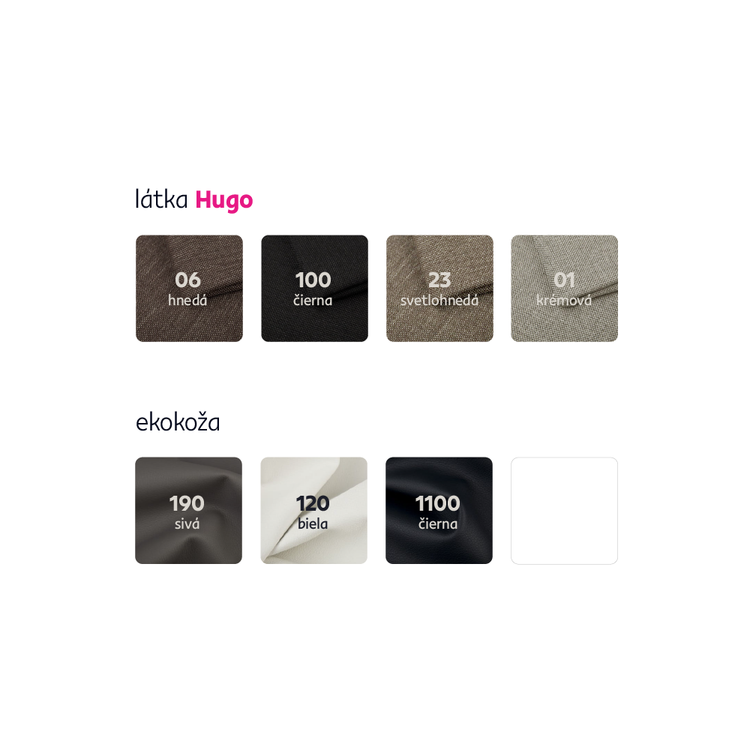 Možnosť objednať v 4 prevedeniach látky Hugo v kombinácií s ekokožou v 3 farebných prevedeniach. Cena sedačky sa pri individuálnej objednávke líši, potrebné je zaplatiť 10% zálohu. Po uhradení zálohy bude Vaša požiadavka zadaná do výroby. Doba dodania 6-8 týždňov.