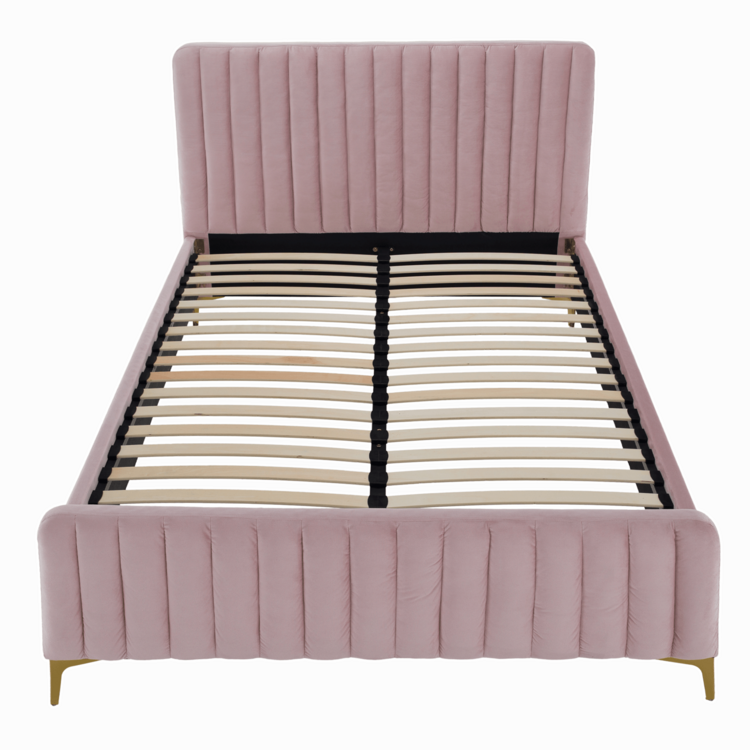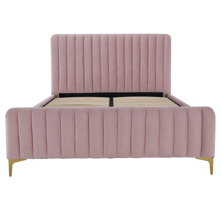 V nadčasovej ružovej farbe, ktorá bola vybratá zo širokej škály farieb. Na čalúnenie bola použitá Velvet látka, ktorá je príjemná na dotyk. Posteľ má vysoké čalúnené čelo, ktoré má navyše dekoratívne šitie. A nezabúdajme na predné čelo, ktoré je taktiež dekoratívne prešité. Kaisa stojí na kovových nohách v prevedení gold chróm zlatý matný. Posteľ KAISA je komfortná, aj nápaditá. Spánok a relax to sú dve veci, na ktorých jej záleží. Dodávame ju s lamelovým roštom. Odporúčame zakúpiť matrac s rozmerom 180x200 cm z našej ponuky.