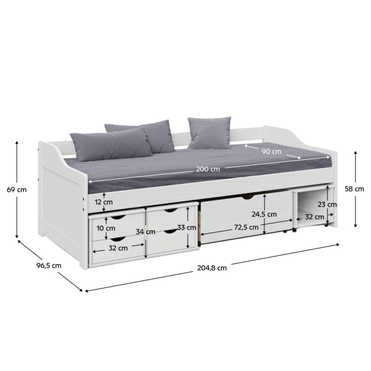 Viacúčelová posteľ MAXI NEW je stvorená do detskej či študentskej izby. Má dostatok úložného priestoru. Súčasťou postele sú štyri malé šuplíky, jeden väčší šuplík na kolieskach a jeden úložný box na kolieskach. Úložný box v prípade potreby hravo nahradí nočný stolík. Posteľ je vyrobená z kvalitného lakovaného masívu, vnesie do miestnosti vôňu prírody. Je dodávaná s roštom, avšak bez matraca, ktorý si môžete objednať z našej ponuky.