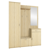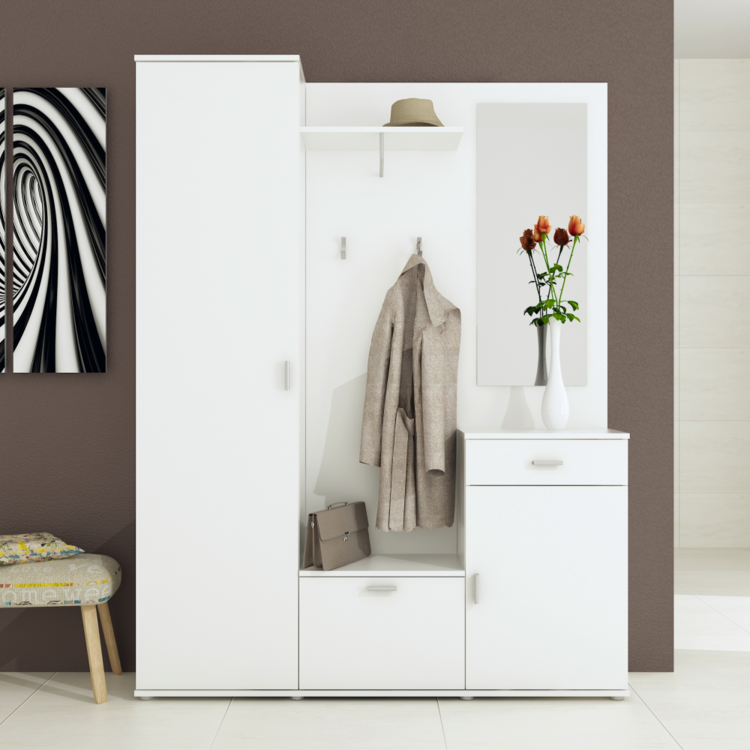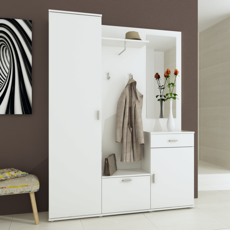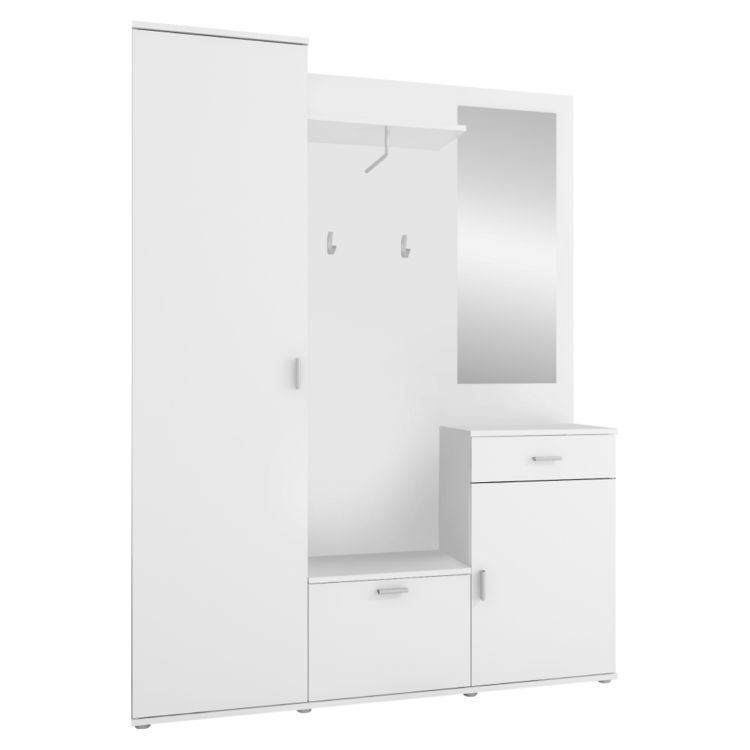 Vďaka bohatej úložnej ploche zabezpečí poriadok vo všetkých kabátoch, bundách, šatkách, klobúkoch, topánkach či kabelkách.Nábytok je vyrobený z laminovanej drevotriesky v prevedení biela. Súčasťou zostavy je elegantné zrkadlo, tri rôzne vysoké skrinky, polica a vešiaková stena. Najvyššia skriňa na ľavej strane je vešiaková s jednou policou, skrinka so šuplíkom na pravej strane ukrýva v sebe jednu policu.