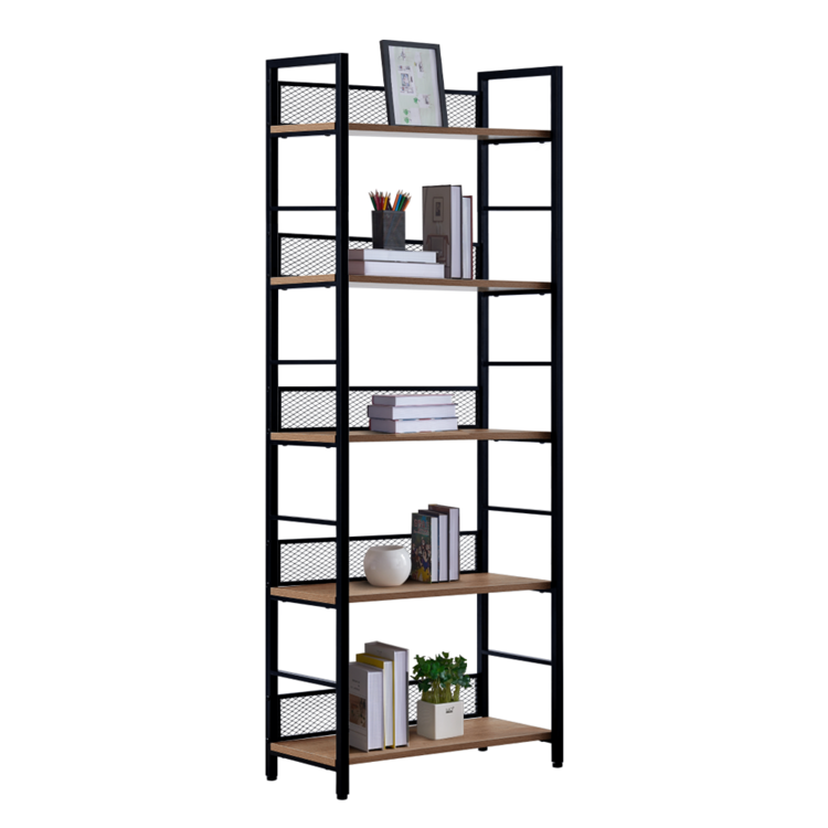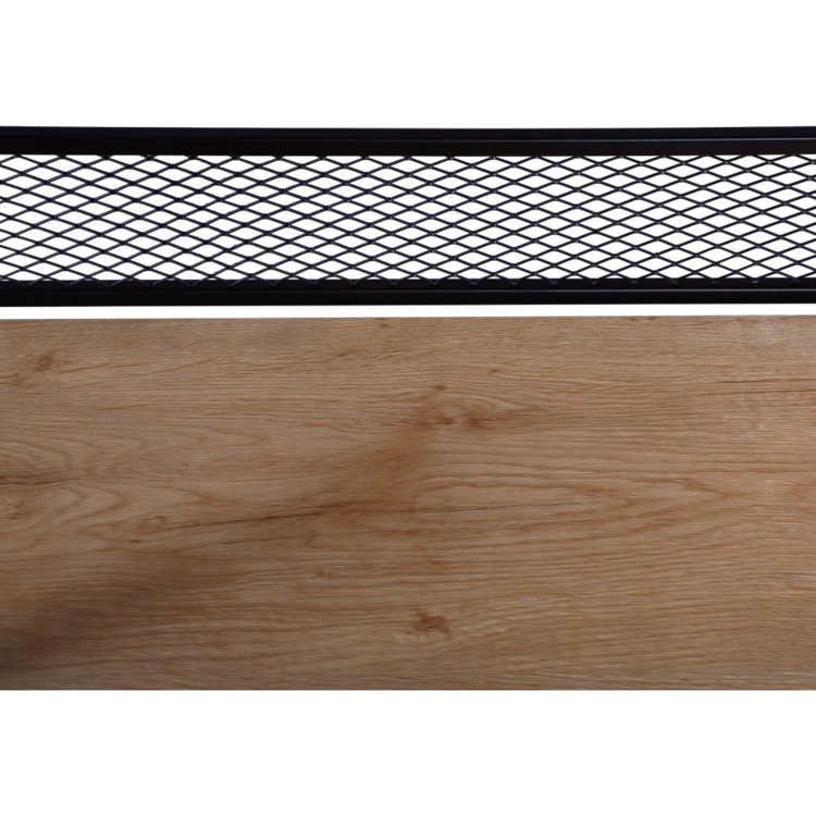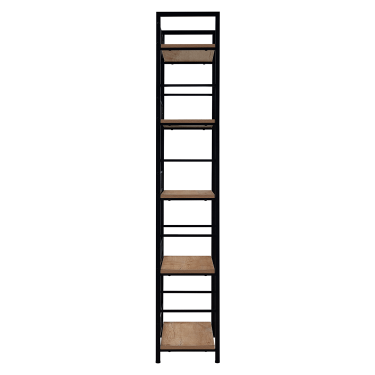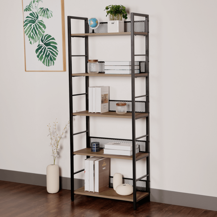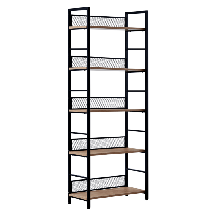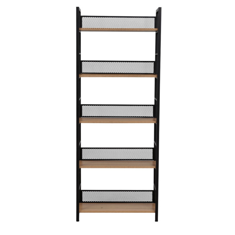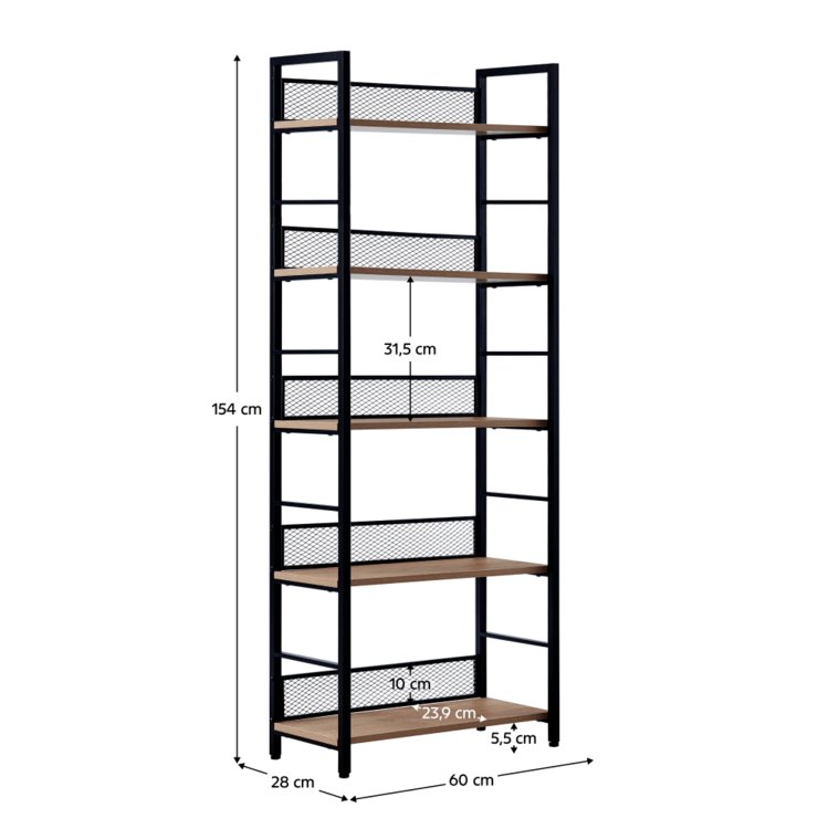 Regál, ktorý poskytuje dostatok úložného priestoru v podobe piatich políc. Stabilitu regálu dodáva kovová konštrukcia v čiernej farbe. Police sú vyrobené z DTD laminovaná v prevedení dub. Farebná kombinácia, ktorá nevyjde z módy. Police sú vhodné na vystavenie kníh, dekorácií, kvetov, ale aj suvenírov z dovoleniek. Regál je na zadnej časti ohraničený čiernou kovovou sieťkou.