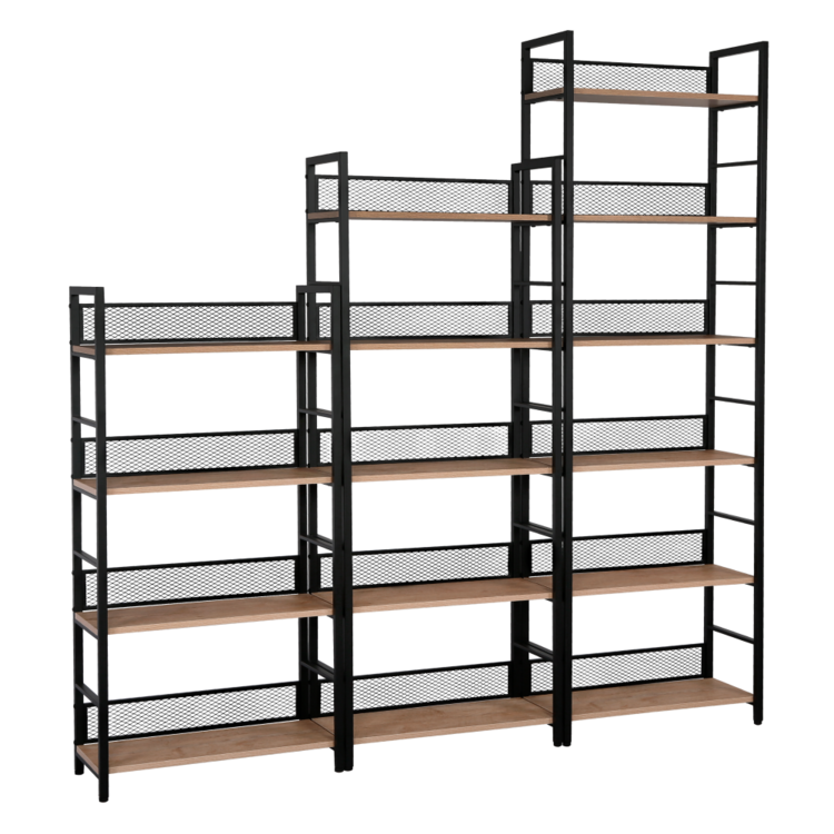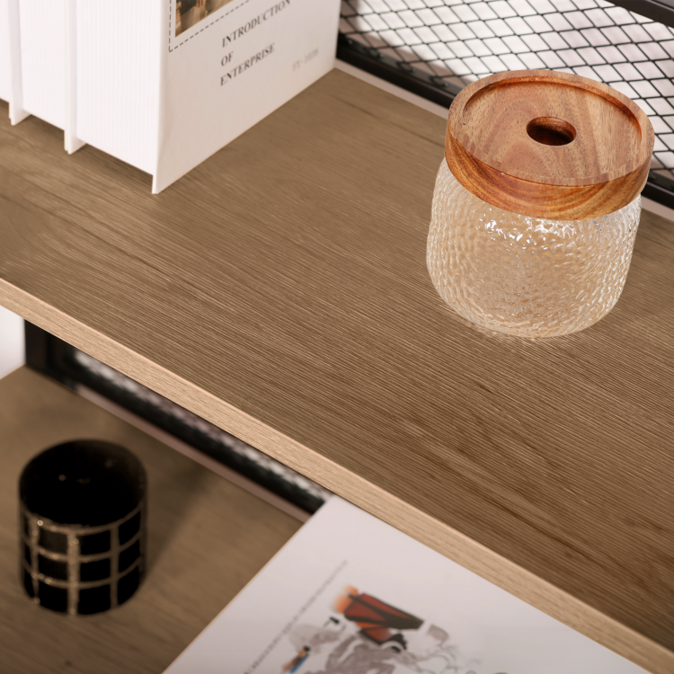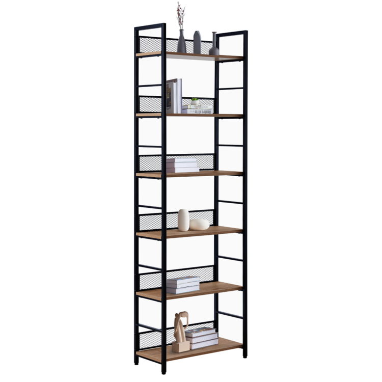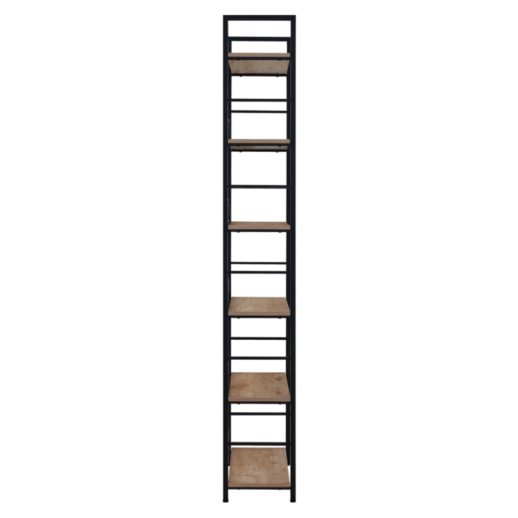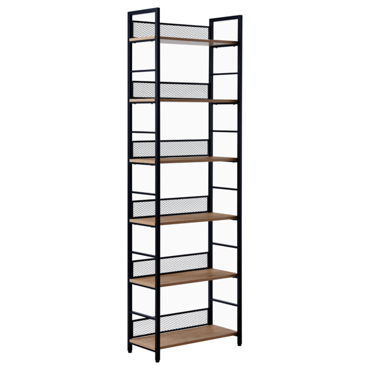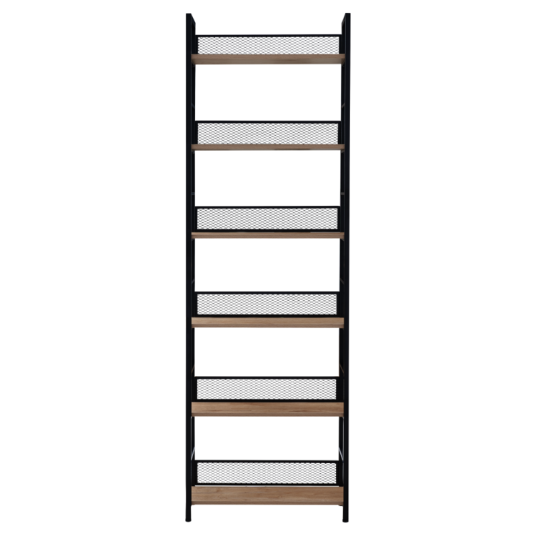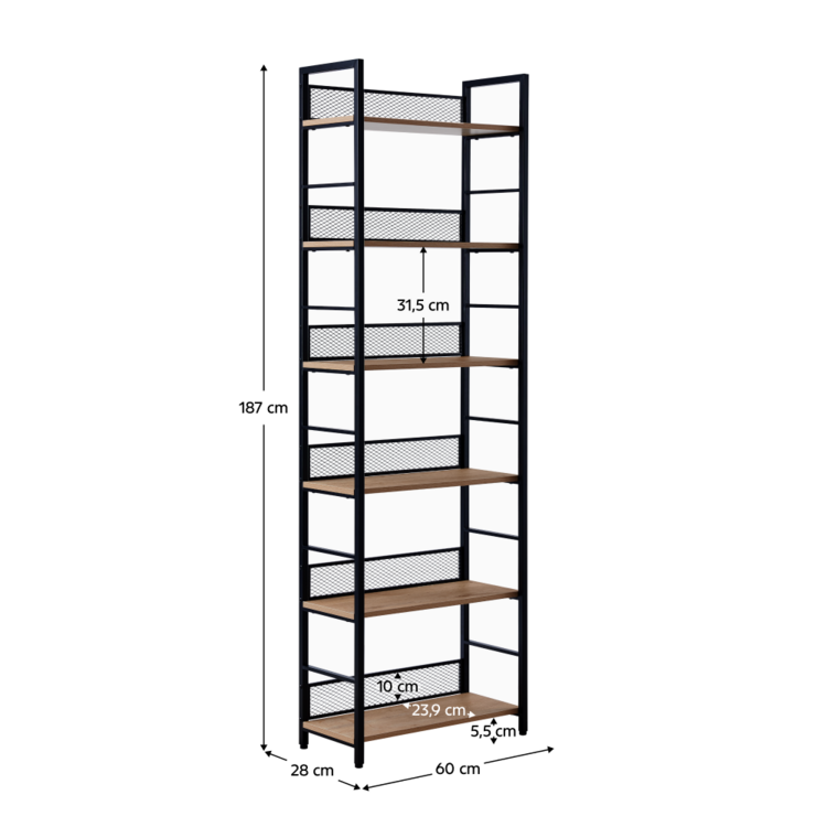 Regál, ktorý poskytuje dostatok úložného priestoru v podobe šiestich políc. Stabilitu regálu dodáva kovová konštrukcia v čiernej farbe. Police sú vyrobené z DTD laminovaná v prevedení dub. Farebná kombinácia, ktorá nevyjde z módy. Police sú vhodné na vystavenie kníh, dekorácií, kvetov, ale aj suvenírov z dovoleniek. Regál je na zadnej časti ohraničený čiernou kovovou sieťkou.