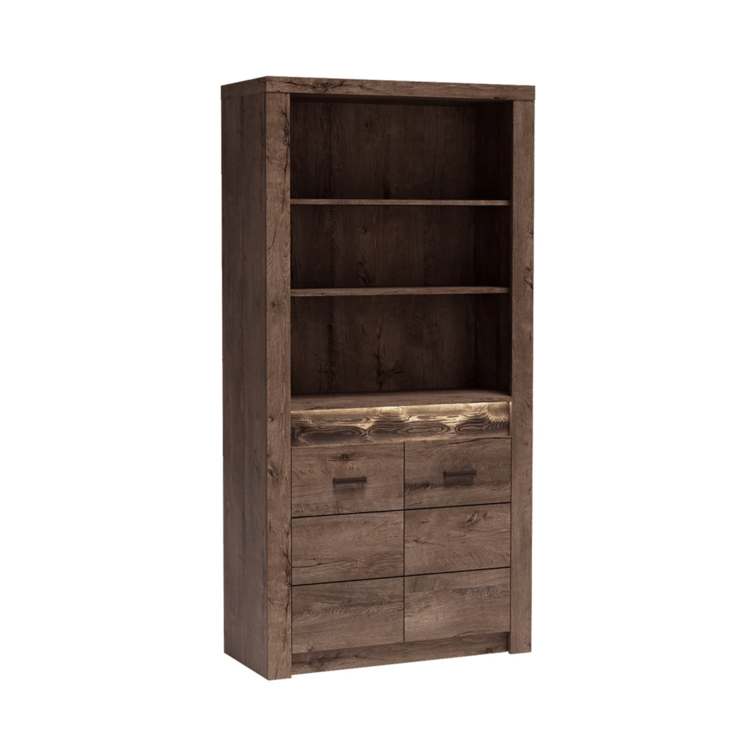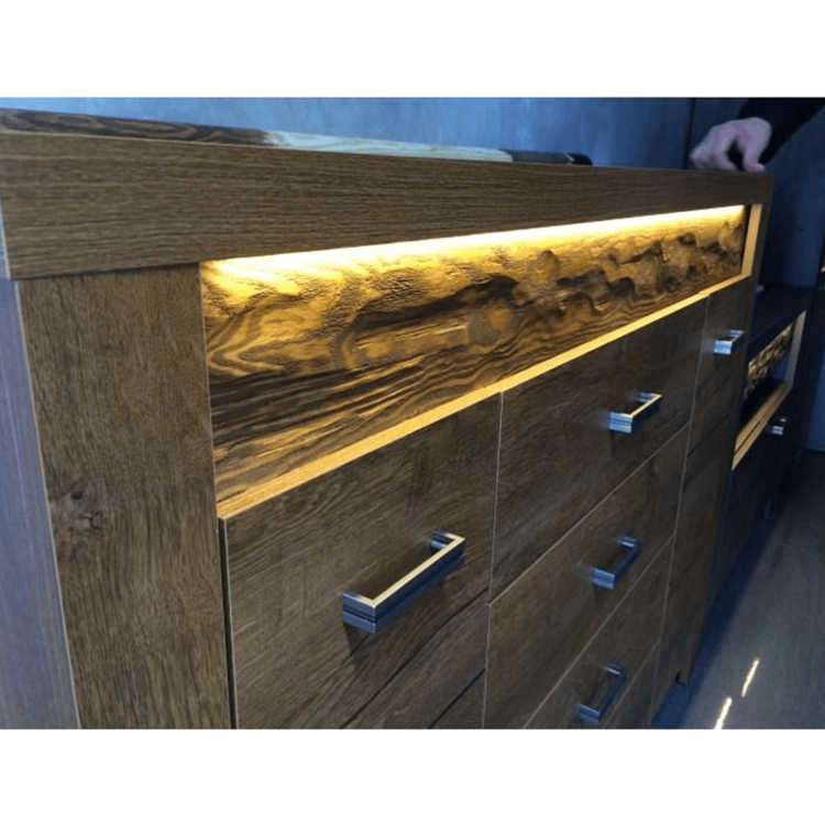 Masívny dizajn s prvkami maľovaného dreva a výraznou reliéfovou kresbou je istota nadčasovosti celého looku zostavy. Kvalitne prepracované detaily a obľúbený materiál laminovaná drevotrieska a ABS hrany garantujú dlhé roky každodenného používania.