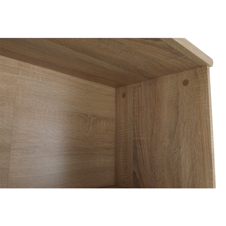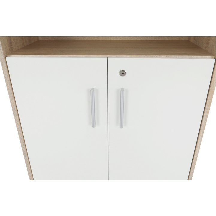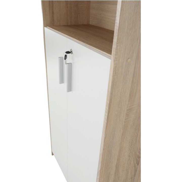 Poskytuje dostatok úložného priestoru. Otvorený úložný priestor je s policou. V spodnej časti nájdete skrinku s dvierkami. Ako bonus je zámok na dvierkach. Skrinka je dvomi policami rozdelená na tri odkladacie plochy. Skrinku dodávame so spodným soklom. Na výrobu bola použitá kvalitná DTD laminovaná vo farebnom prevedení dub sonoma a biela.