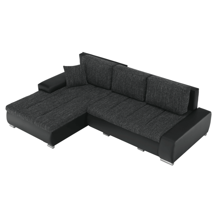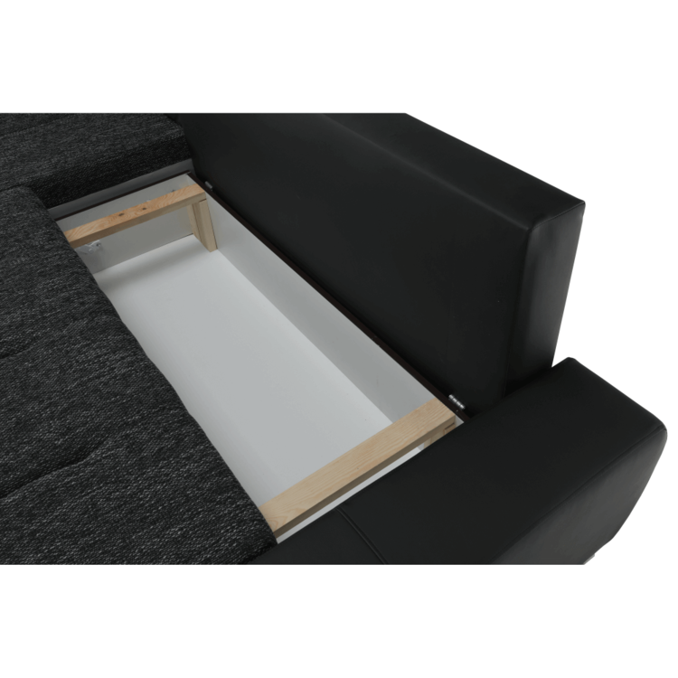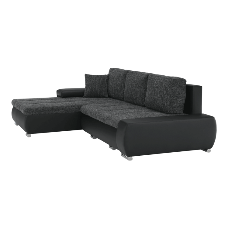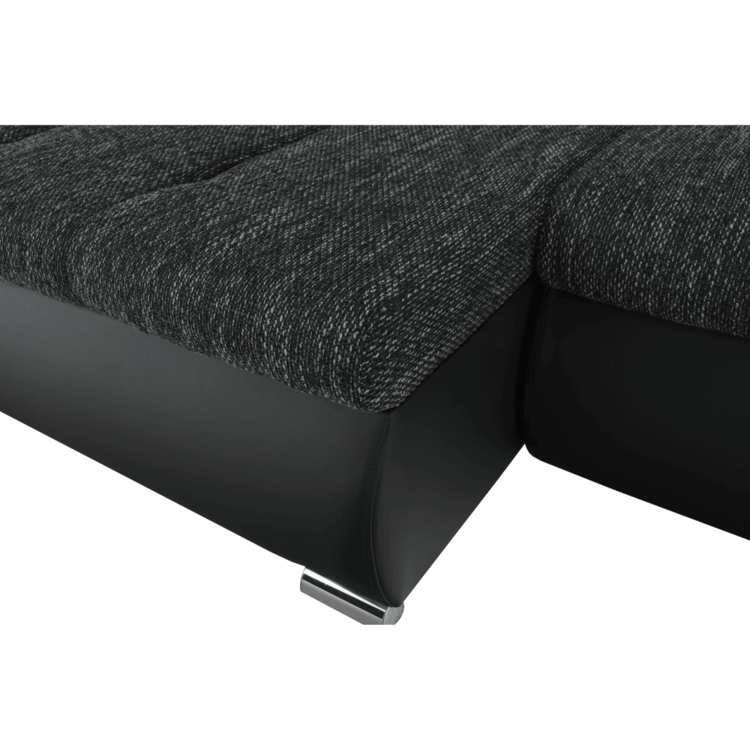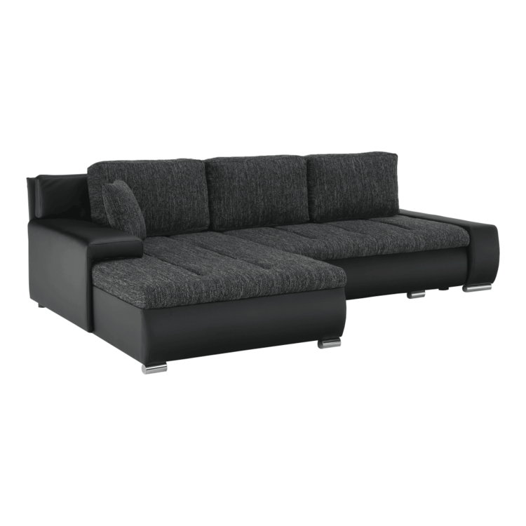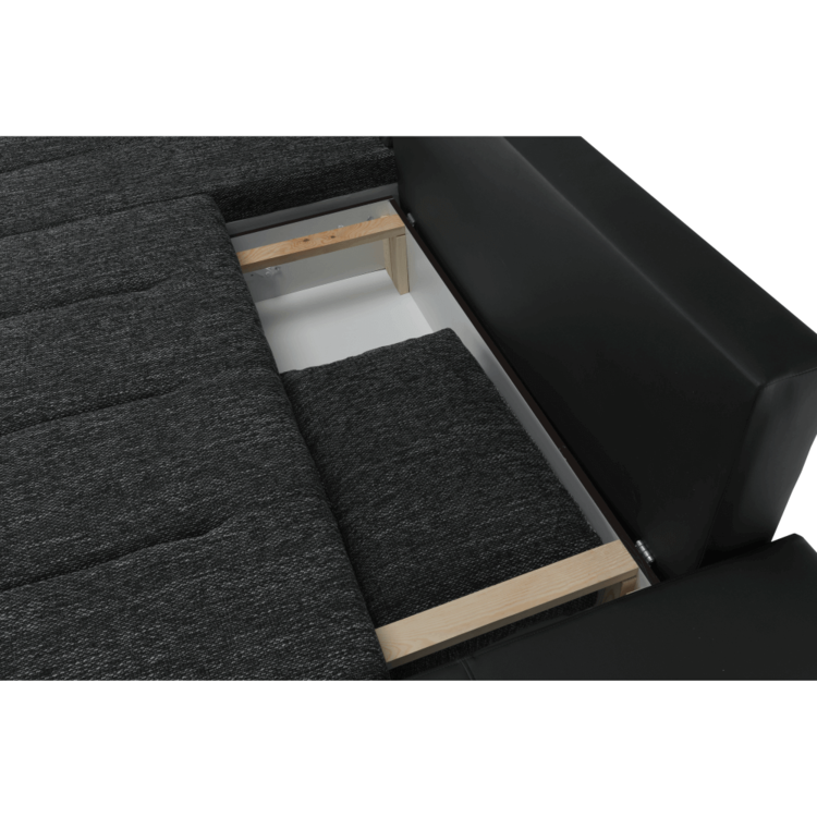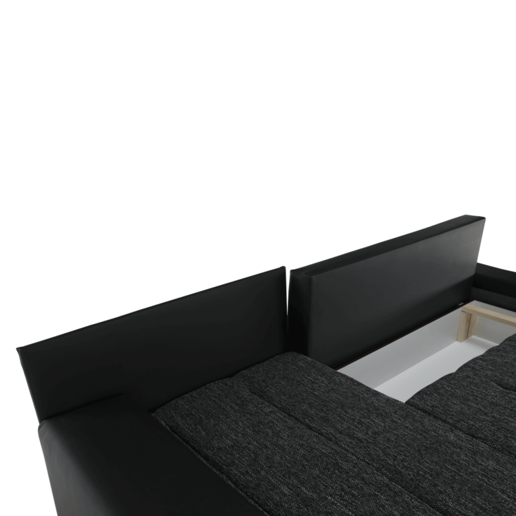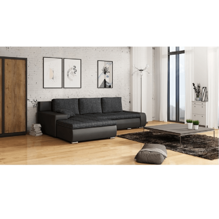 Ekokožu dopĺňa kvalitná látka Berlin. Keďže čierna farba nikdy nevyjde z módy, dizajnéri zvolili práve tento jedinečný odtieň. Sedacia časť je čalúnená v látke v odtieni čierny melír. Je rozkladacia, za niekoľko sekúnd ju dokážete zmeniť na lôžko. Univerzálne prevedenievám umožňuje zmontovať sedačku s otomanom na pravej alebo ľavej strane, voľba je na vás. Na nepotrebné veci poslúži úložný priestor v čelnej časti sedacej súpravy. Súčasťou sedacej súpravy sú aj štyri vankúše.