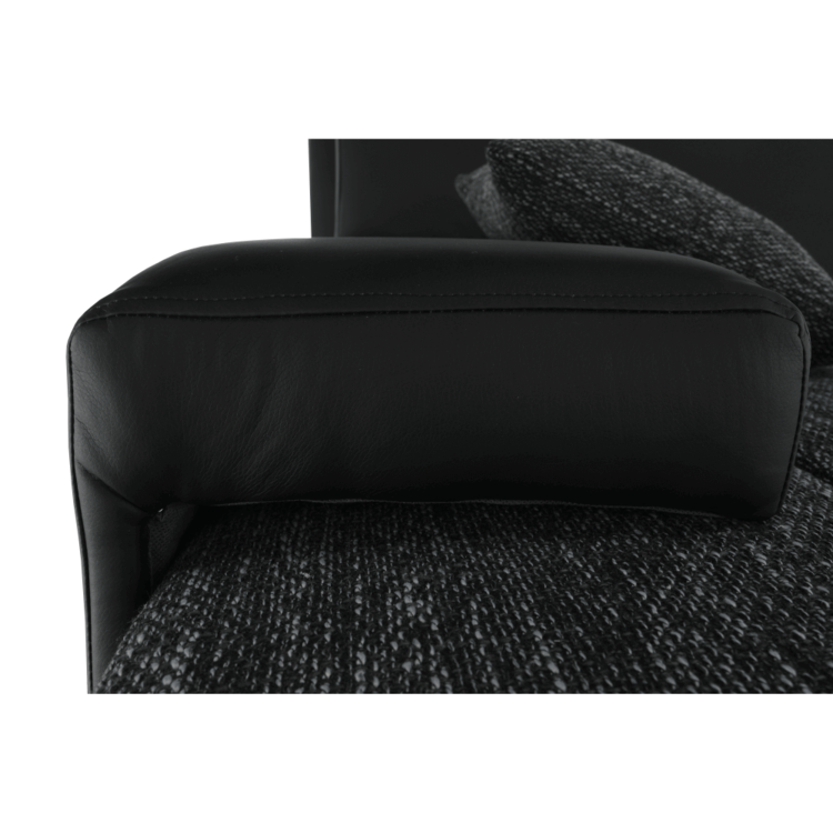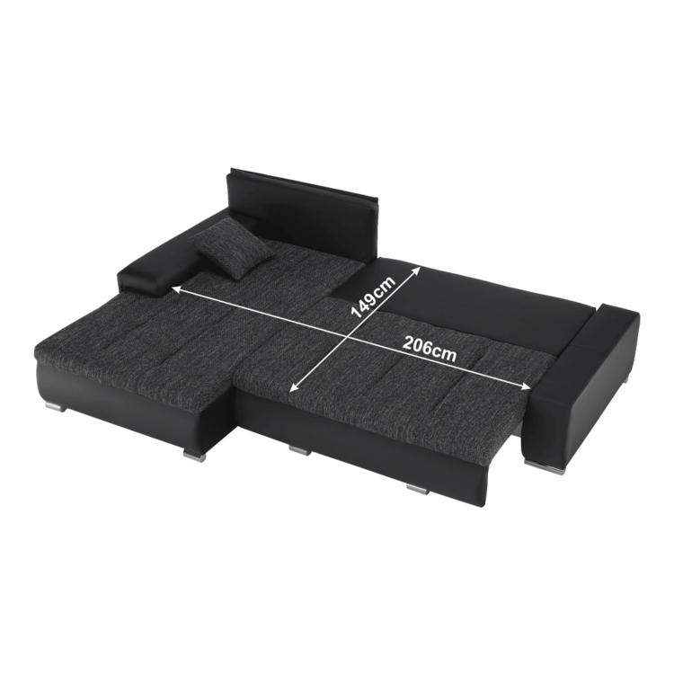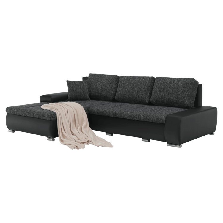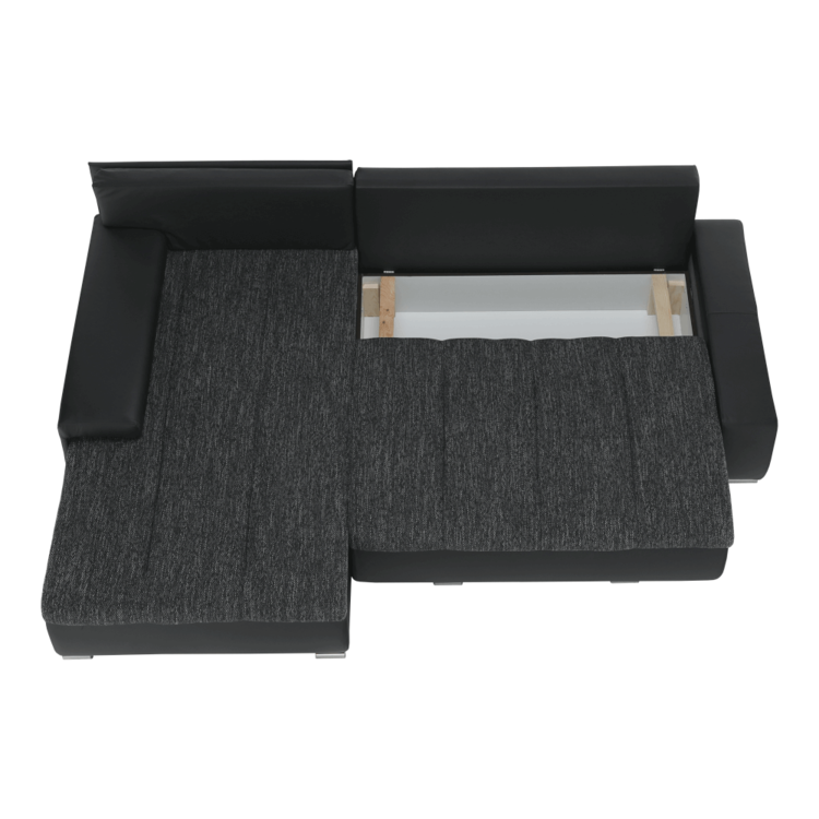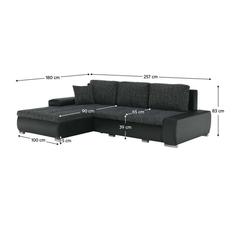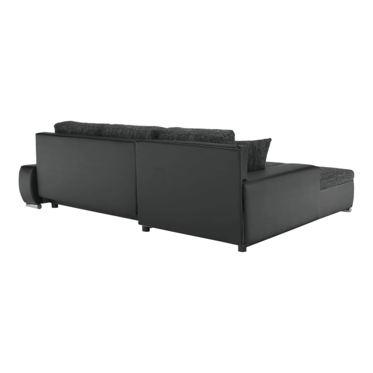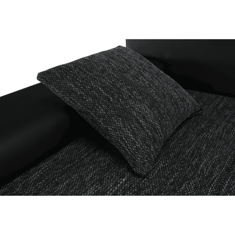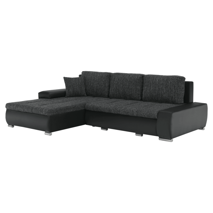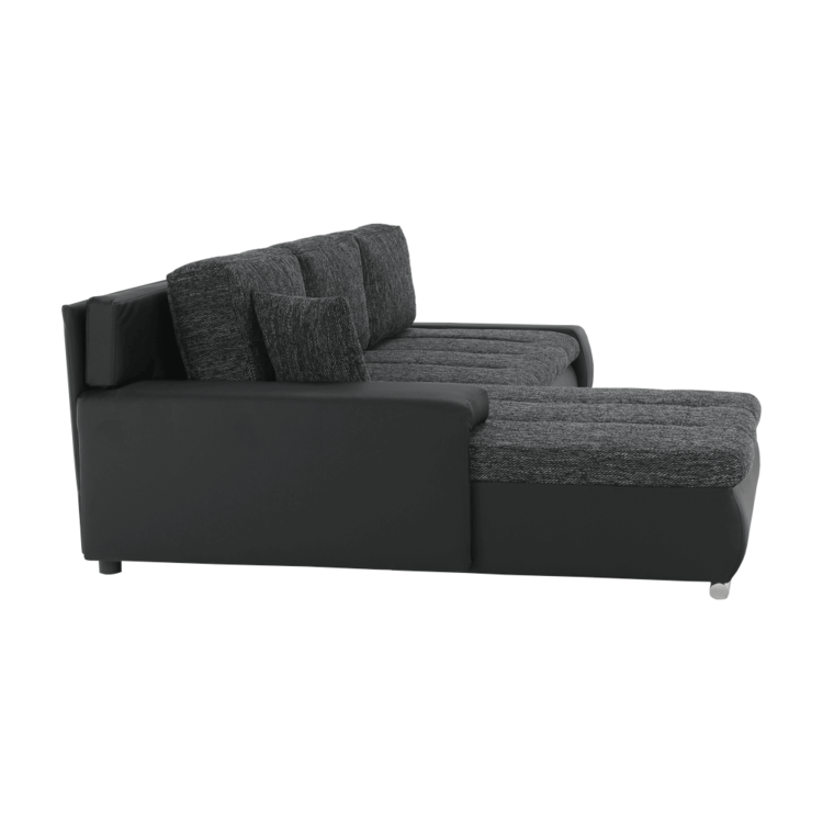 Ekokožu dopĺňa kvalitná látka Berlin. Keďže čierna farba nikdy nevyjde z módy, dizajnéri zvolili práve tento jedinečný odtieň. Sedacia časť je čalúnená v látke v odtieni čierny melír. Je rozkladacia, za niekoľko sekúnd ju dokážete zmeniť na lôžko. Univerzálne prevedenievám umožňuje zmontovať sedačku s otomanom na pravej alebo ľavej strane, voľba je na vás. Na nepotrebné veci poslúži úložný priestor v čelnej časti sedacej súpravy. Súčasťou sedacej súpravy sú aj štyri vankúše.