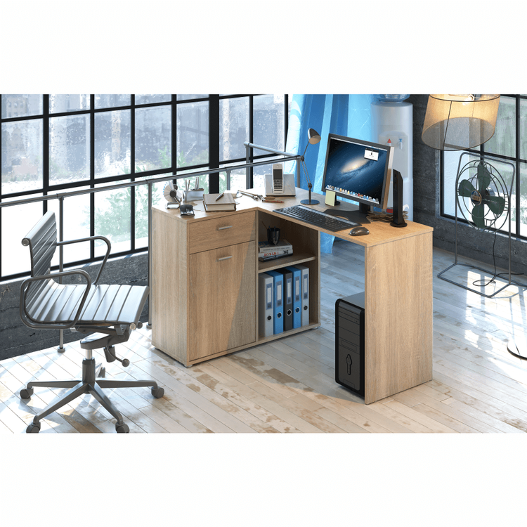 Rohový PC stôl KALIMERO s jednoduchými a čistými líniami zapadne do každého interiéru. Vyrobený je z DTD laminovanej v prevedení dub sonoma. Poskytuje množstvo úložného priestoru v podobe šuplíka, skrinky a otvoreného úložného priestoru. Či už pracujete z domu, alebo vaše dieťa potrebuje miesto na plnenie školských povinností, Kalimero splní všetky vaše požiadavky.