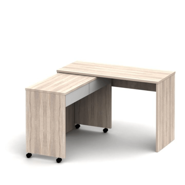 Rozkladací PC stôl so šuplíkmi VERSAL NEW, ktorý je navyše rozkladací. Klasický pracovný stôl sa jednoduchým spôsobom zmení na rohový s veľkou pracovnou plochou. To umožňujú kolieska na menšej časti stola. Diely stola môžete postaviť za seba alebo vedľa seba, jednoducho VERSAL má niekoľko možností, ktoré odhalíte pri jeho častom používaní. Za svoj moderný dizajn môže vďačiť DTD laminovanej drevotrieske vo farebnom prevedení dub sonoma/biela. Dva šuplíky sú zakomponované do jeho výbavy. Navyše je to kvalitný slovenský výrobok.